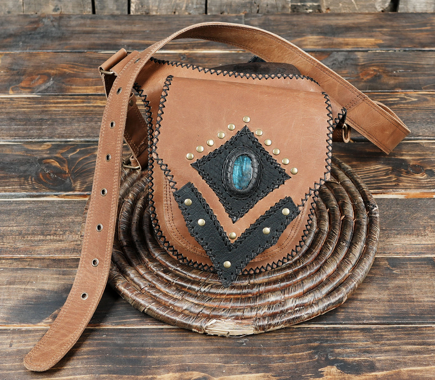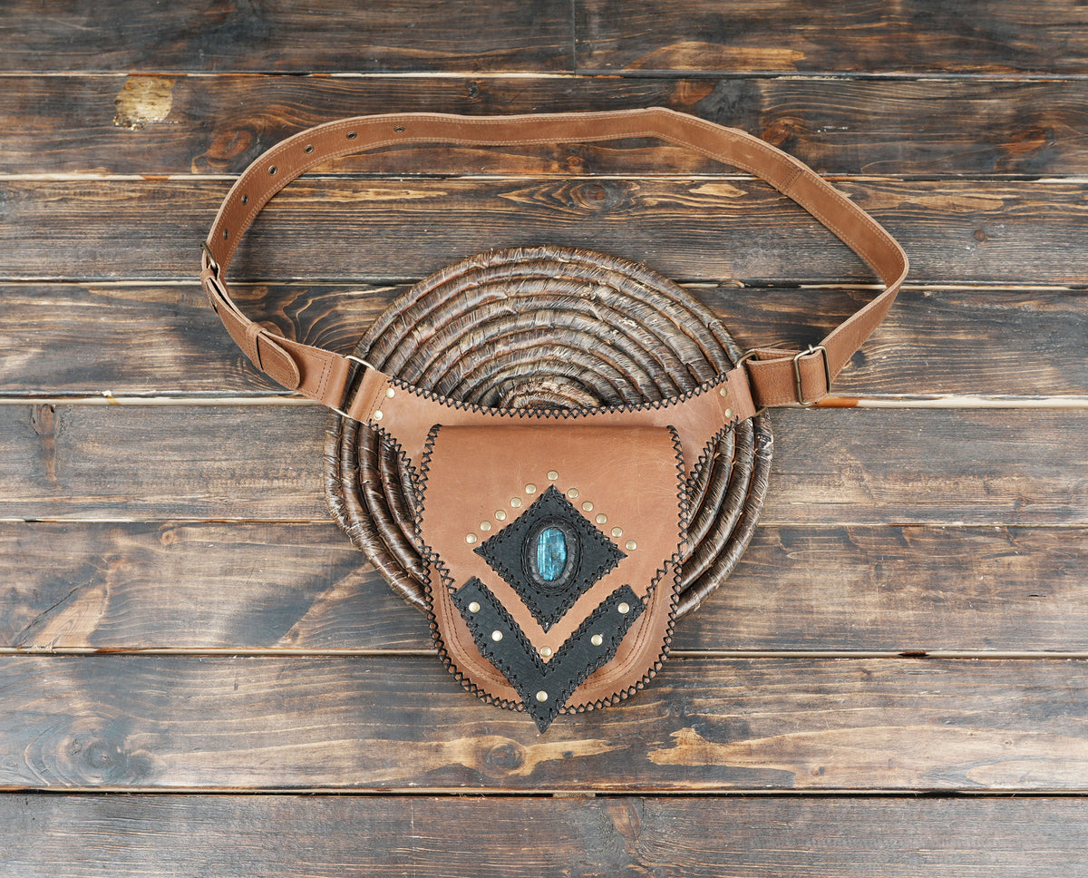 Handmade Brown Leather Waist Belt with Blue Gemstone Accent | Boho Tribal Leather Belt with Gemstone and Brass Detailing For Unisex (LT/AB/WB/6157) - Brown / S = 28 to 32 / Antic Brass