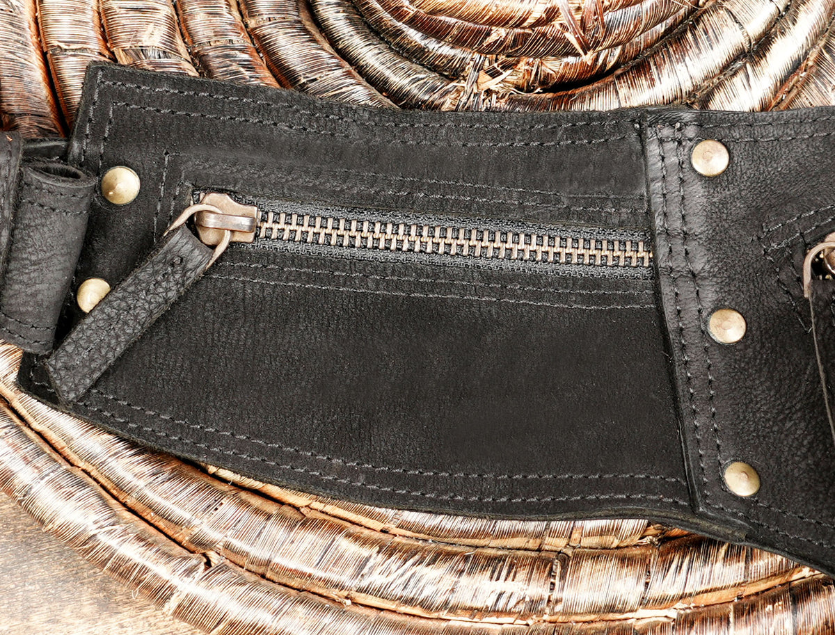 Handcrafted Leather Waist Thigh Belt with Fringe and Pockets || Handcrafted Leather Waist Belt with Zipper Pouch and Fringe(LT-AB-WB-6178) - Black / S - 28 TO 32 / Antic Brass