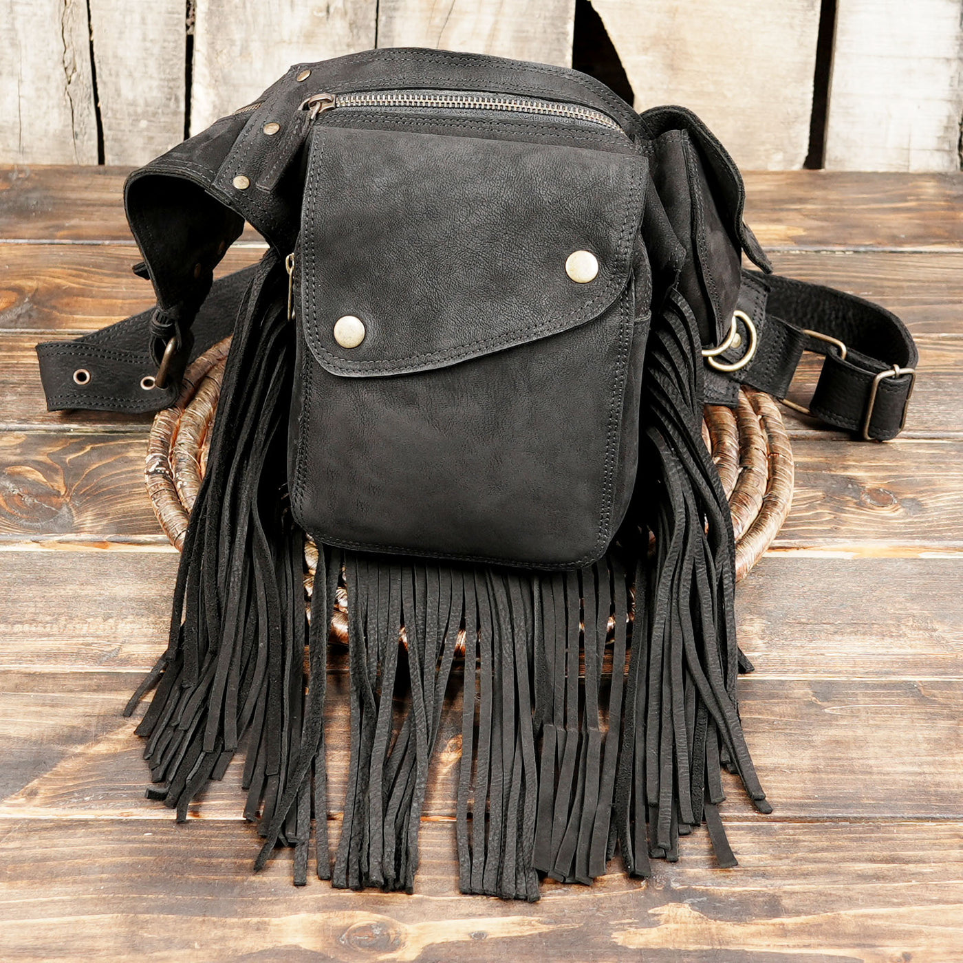 This handmade leather piece is crafted from premium quality leather with strong stitching for long lasting wear. It features multiple zipper and snap pockets to carry essentials like a phone, wallet, keys, and small items. Designed for versatile use, it can be worn as a waist belt, hip holster, or crossbody bag. The fringe detailing adds a bold festival inspired look, making it ideal for travel, adventure, festivals, and cosplay.