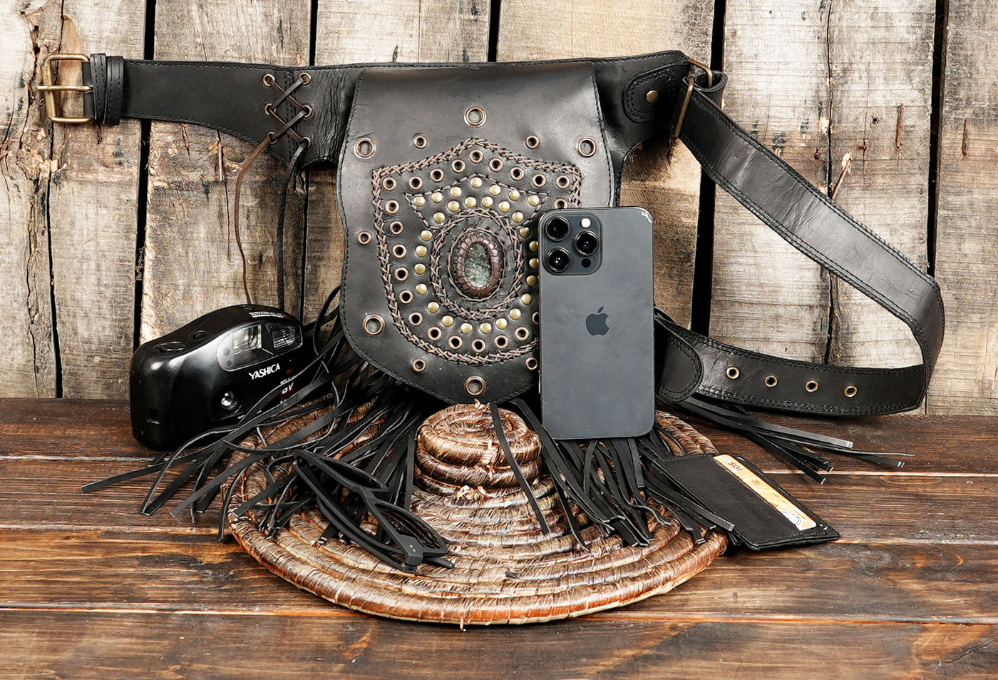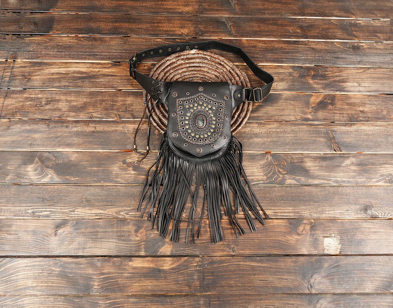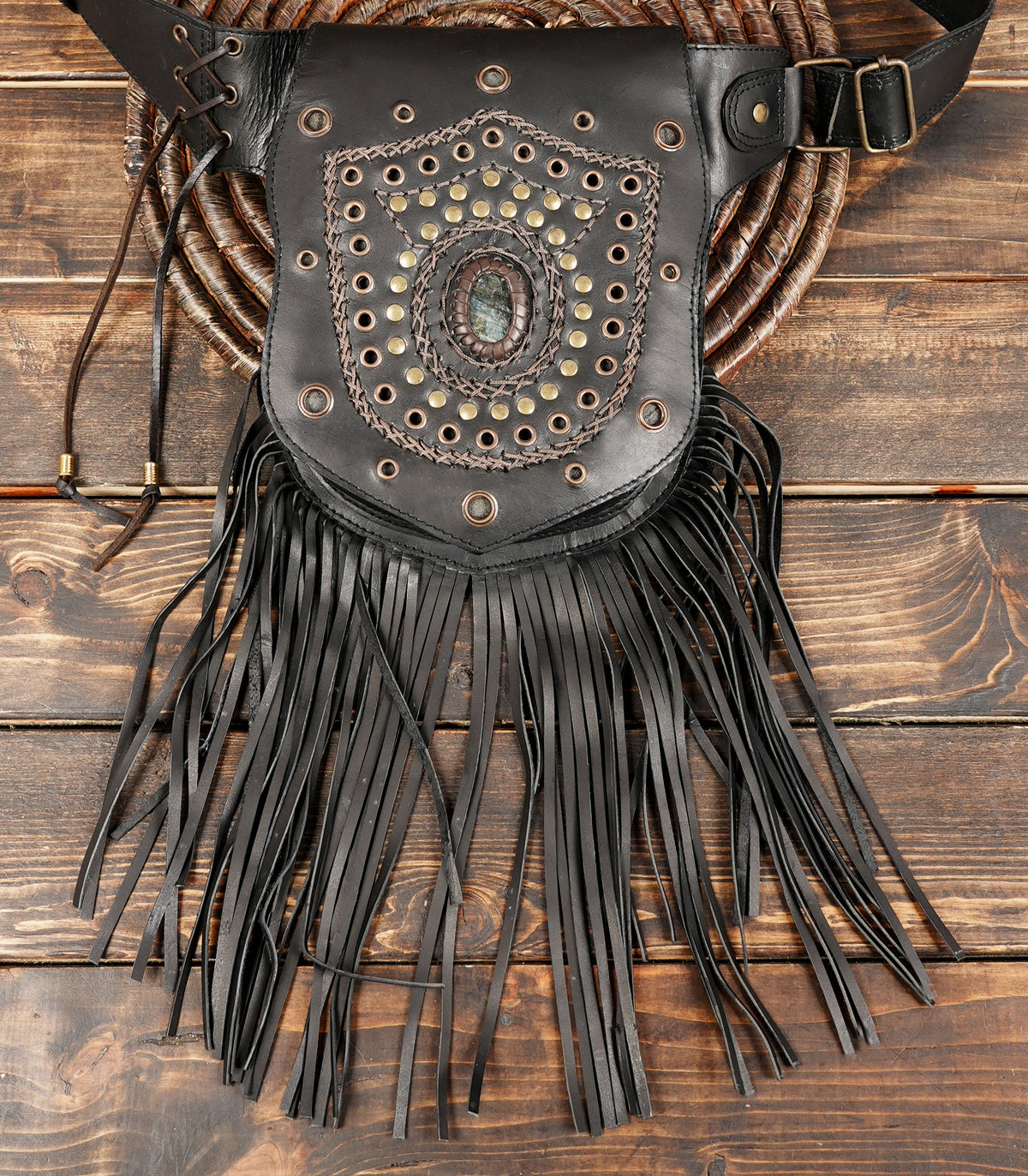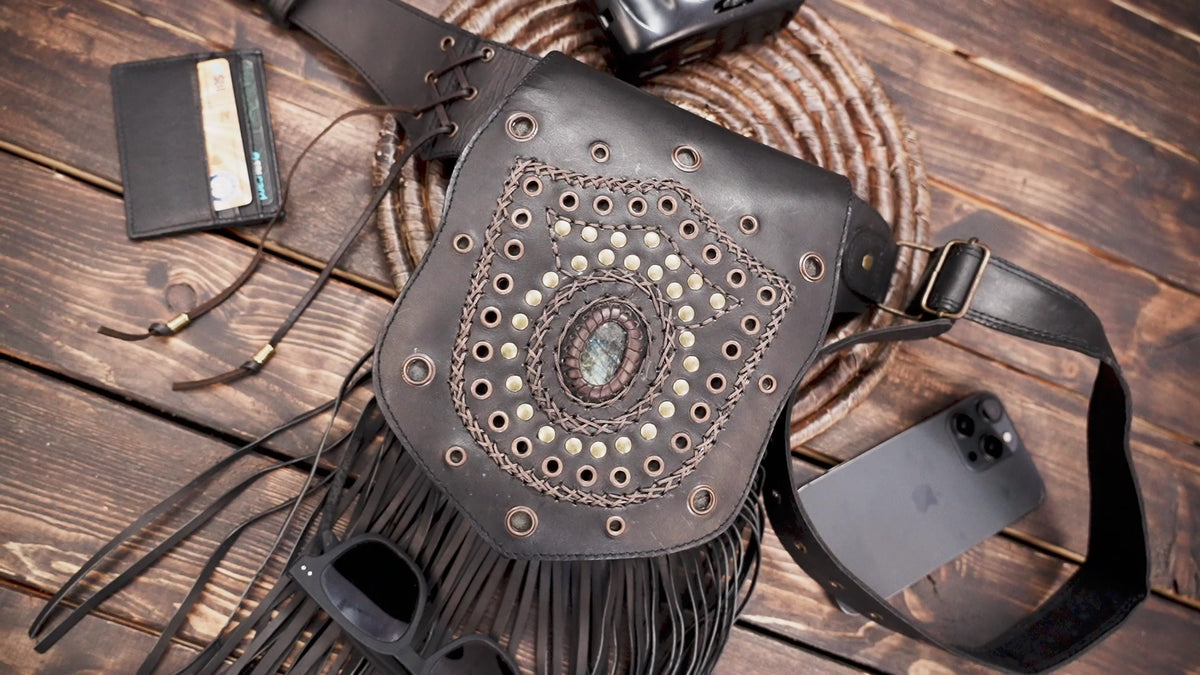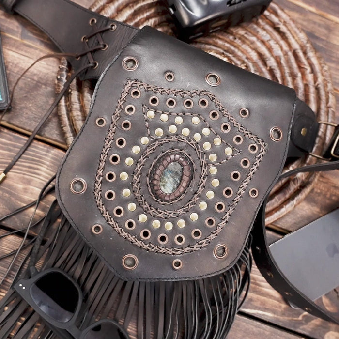 Handmade Genuine Leather Waist Belt with Gemstone || Gothic Boho Leather Belt Bag with Stone Centerpiece (LT-AB-WB-6124) - Black / S - 28 TO 32 / Antic Brass