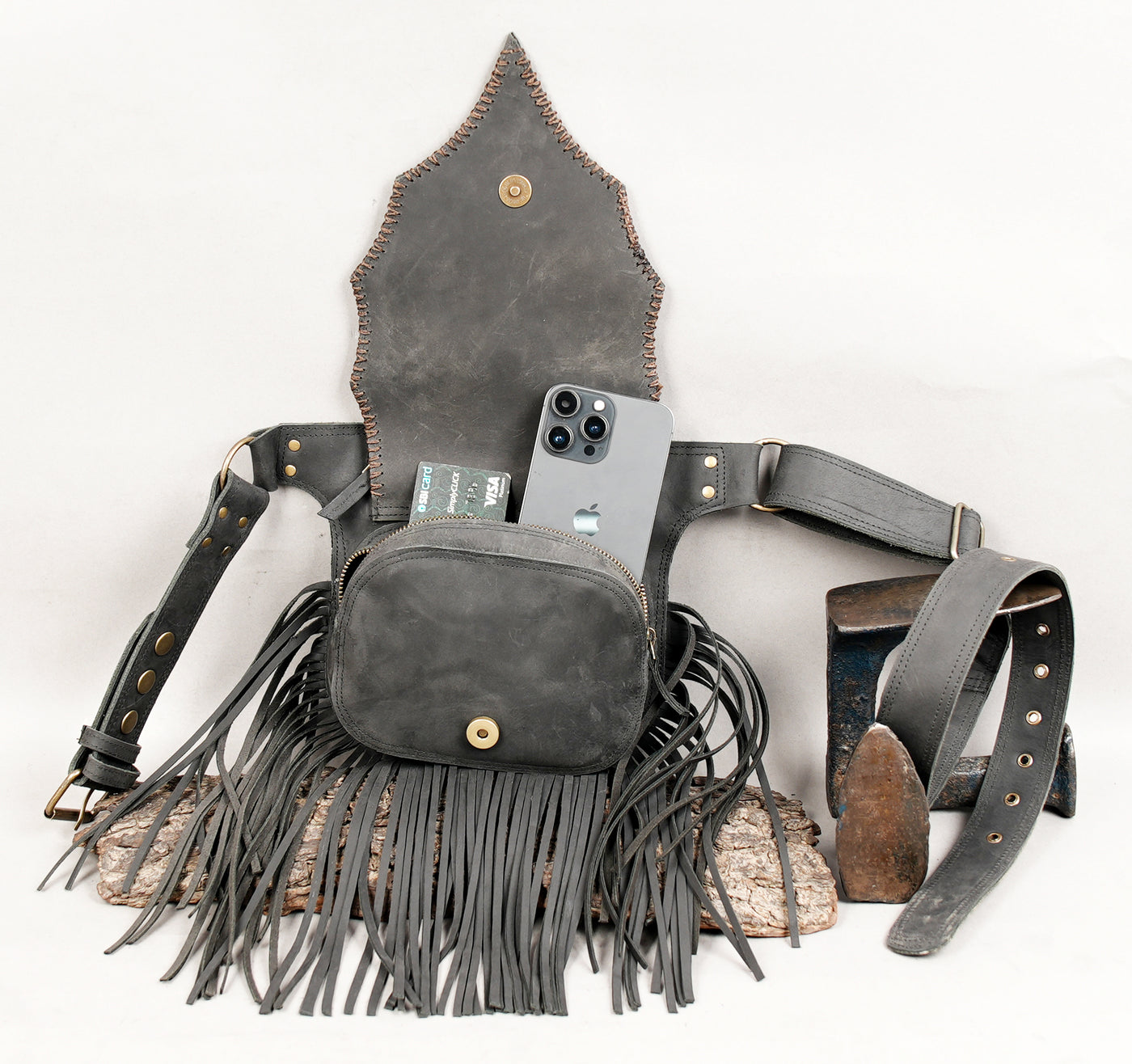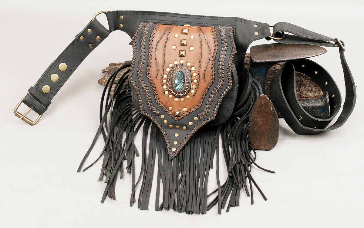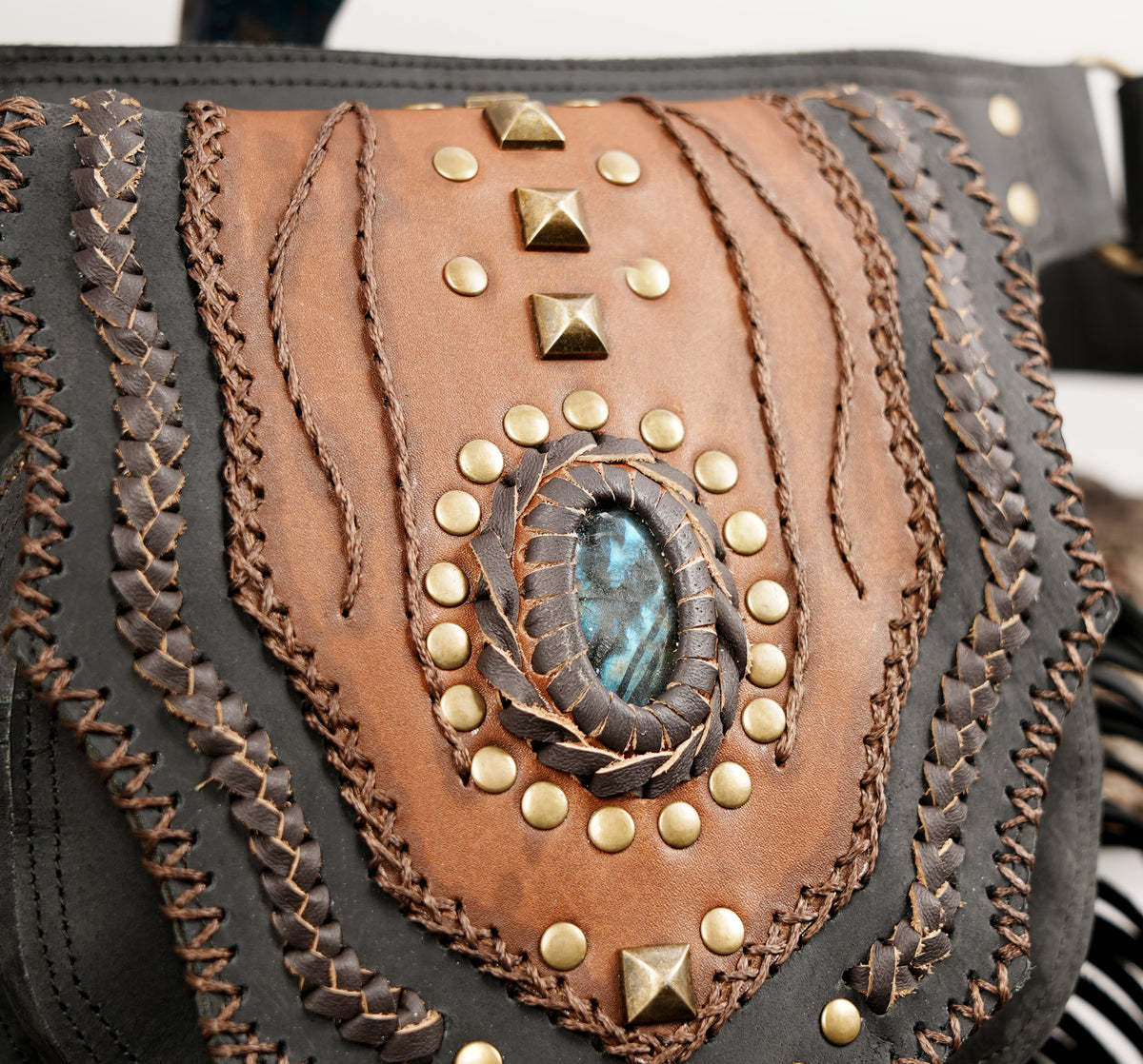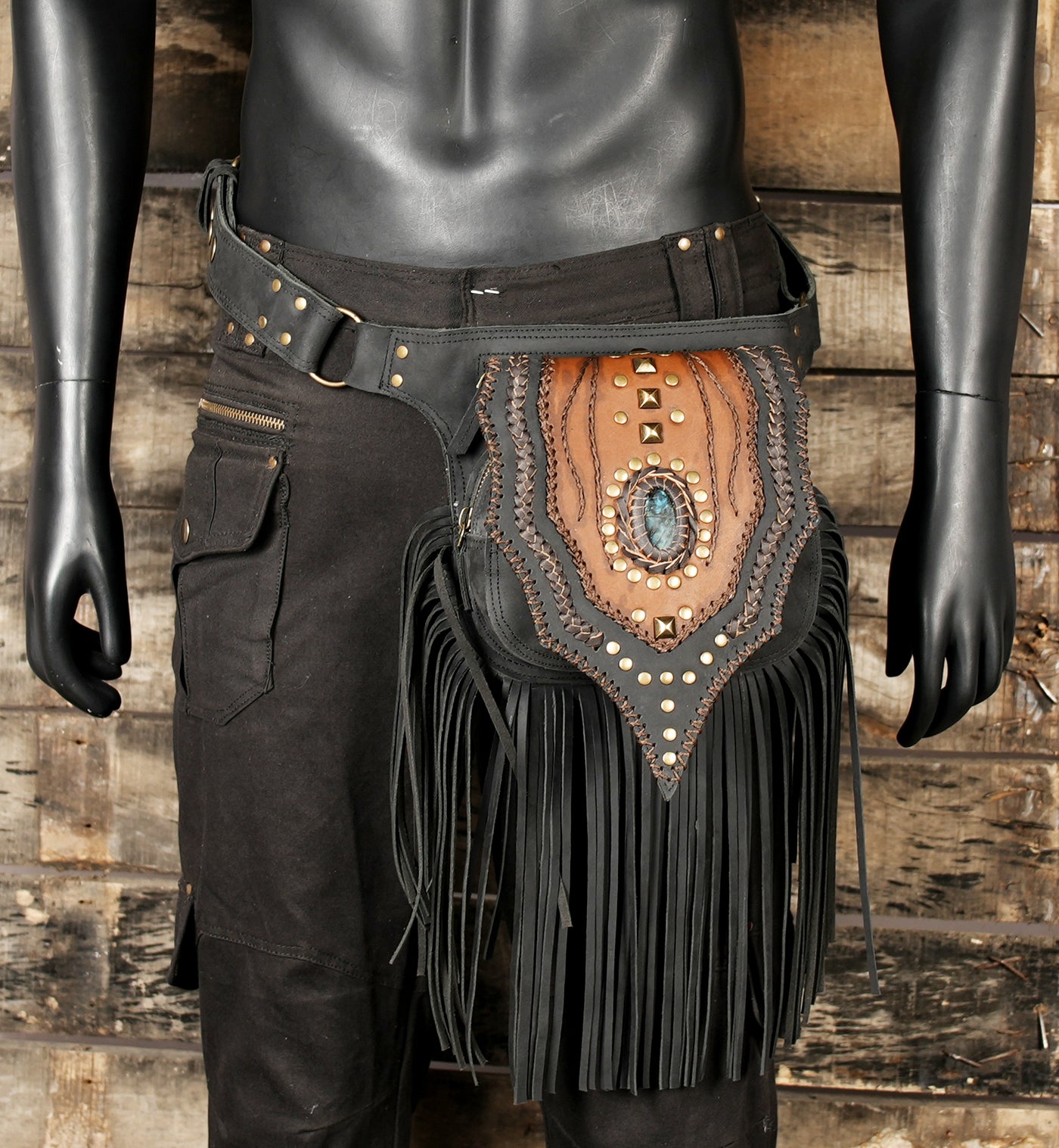 Handmade Leather Fringe Waist Belt with Gemstone Centerpiece || Boho Leather Hip Bag with Gemstone and Long Fringe (LT/AB/WB/6006) - Black / S - 28 TO 32 / Antic Brass