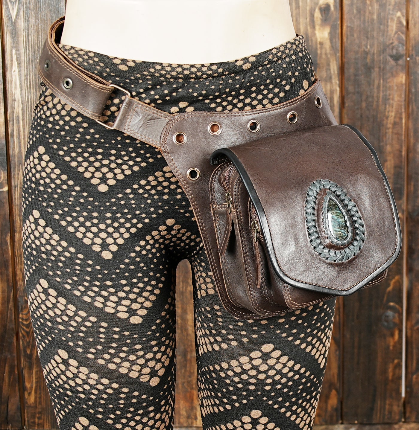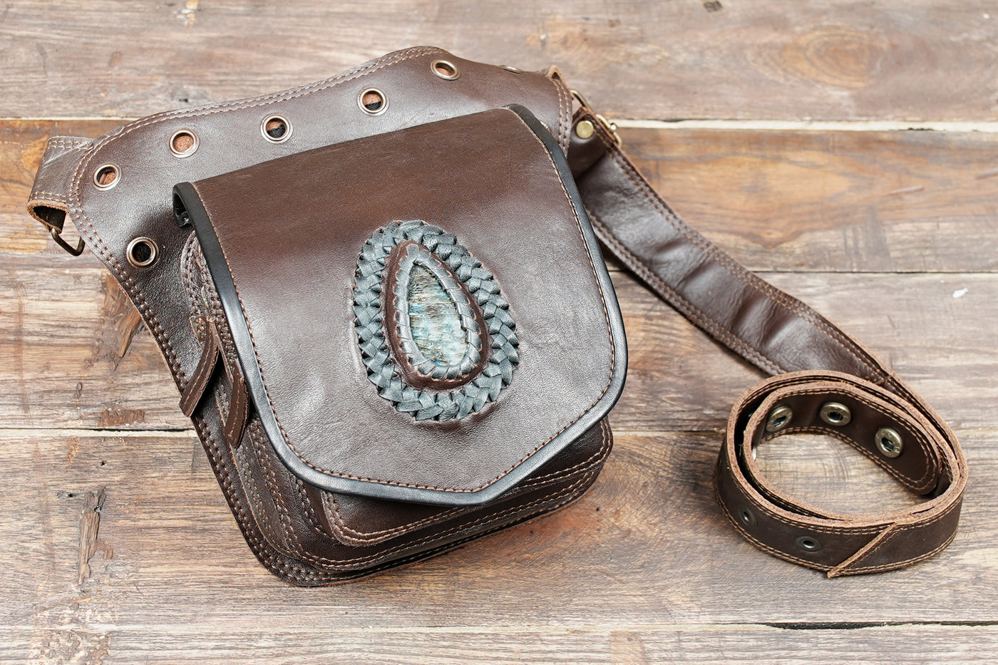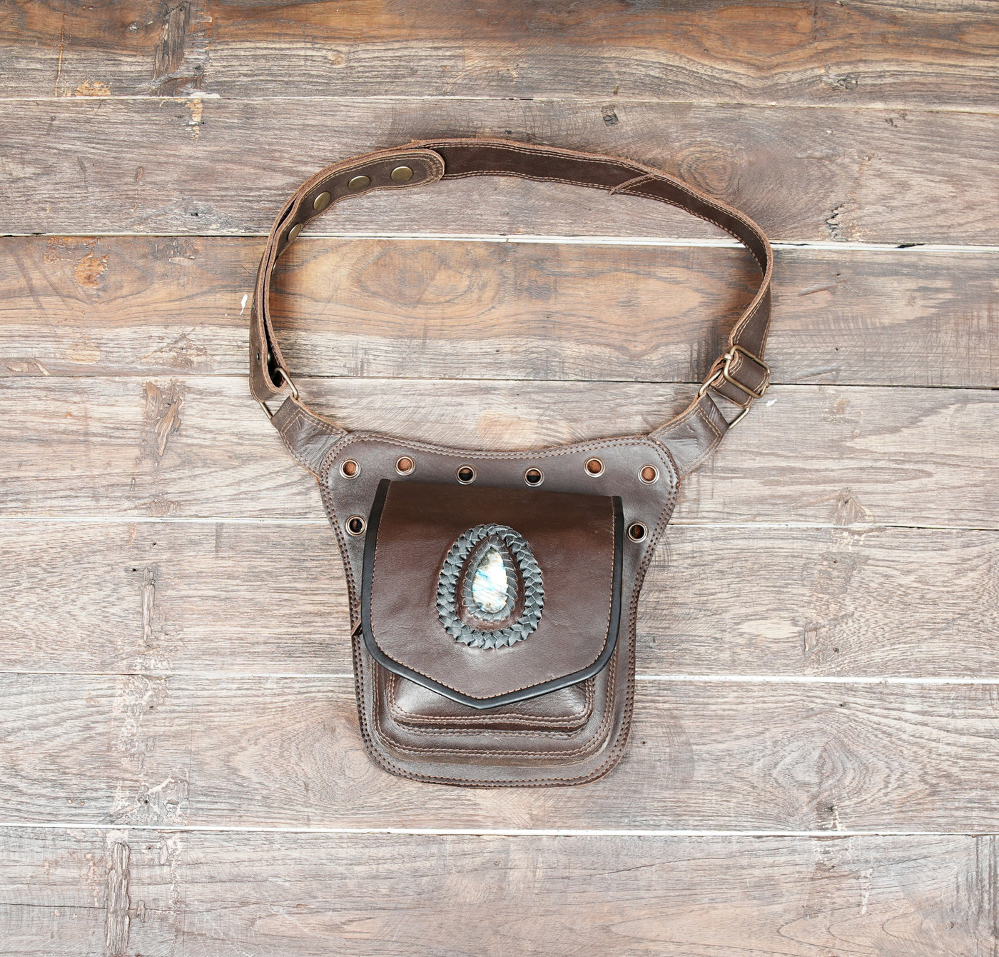 This premium handmade leather belt is crafted from high-quality genuine leather with a rugged finish. It includes a natural gemstone centerpiece that adds a unique and stylish touch. The strong brass buckle keeps everything secure while giving the belt a classic look. Its practical compartments provide space for your phone, wallet, keys, and other essentials. With multiple buckle holes, it adjusts easily for a comfortable fit on different waist sizes.