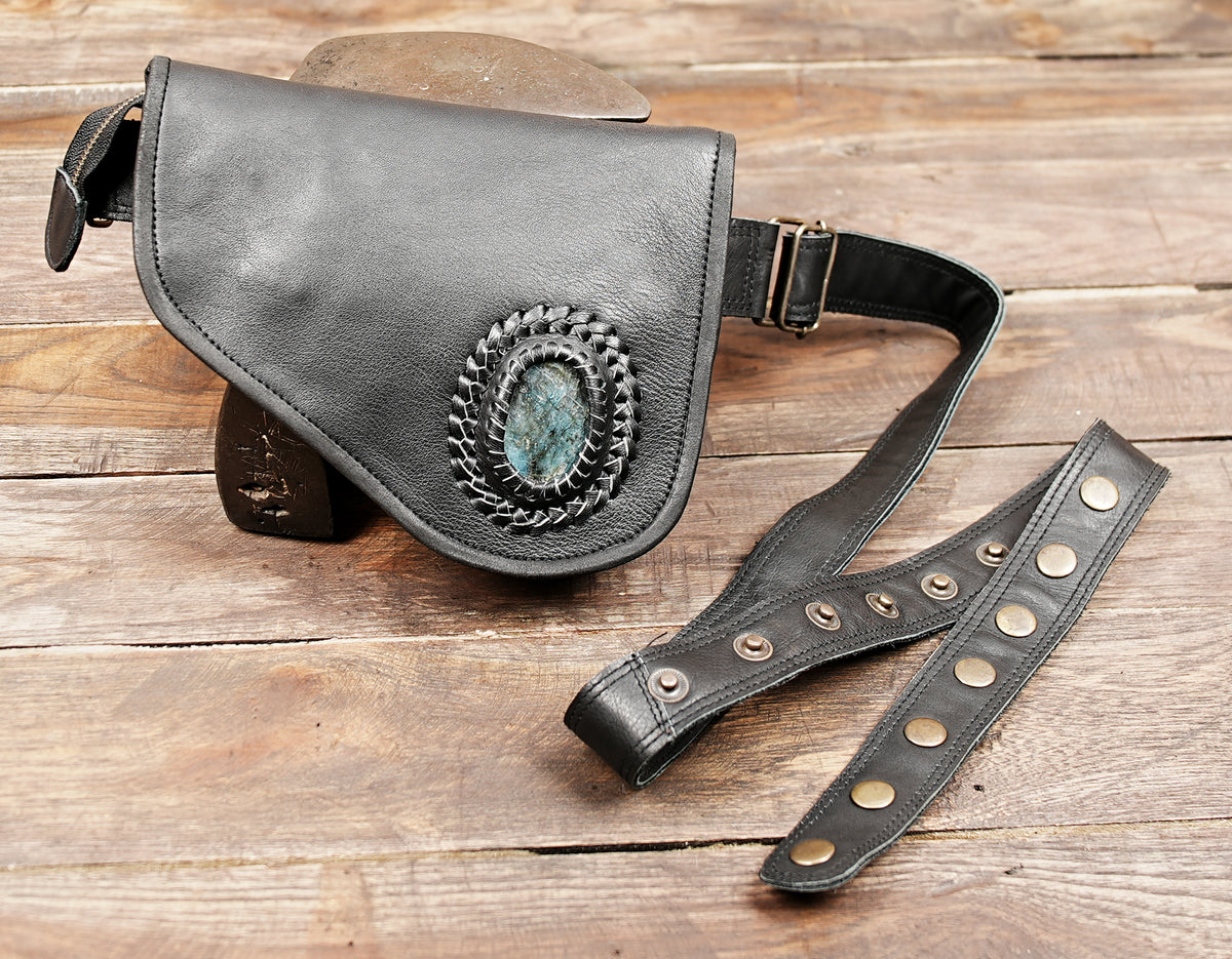 Leather Waist Utility Belt Pouch for Festivals and Travel || Handcrafted Leather Festival Waist Belt with Zipper Pocket (LT-AB-WB-6155) - Black / S – 28 TO 32 / Antic Brass