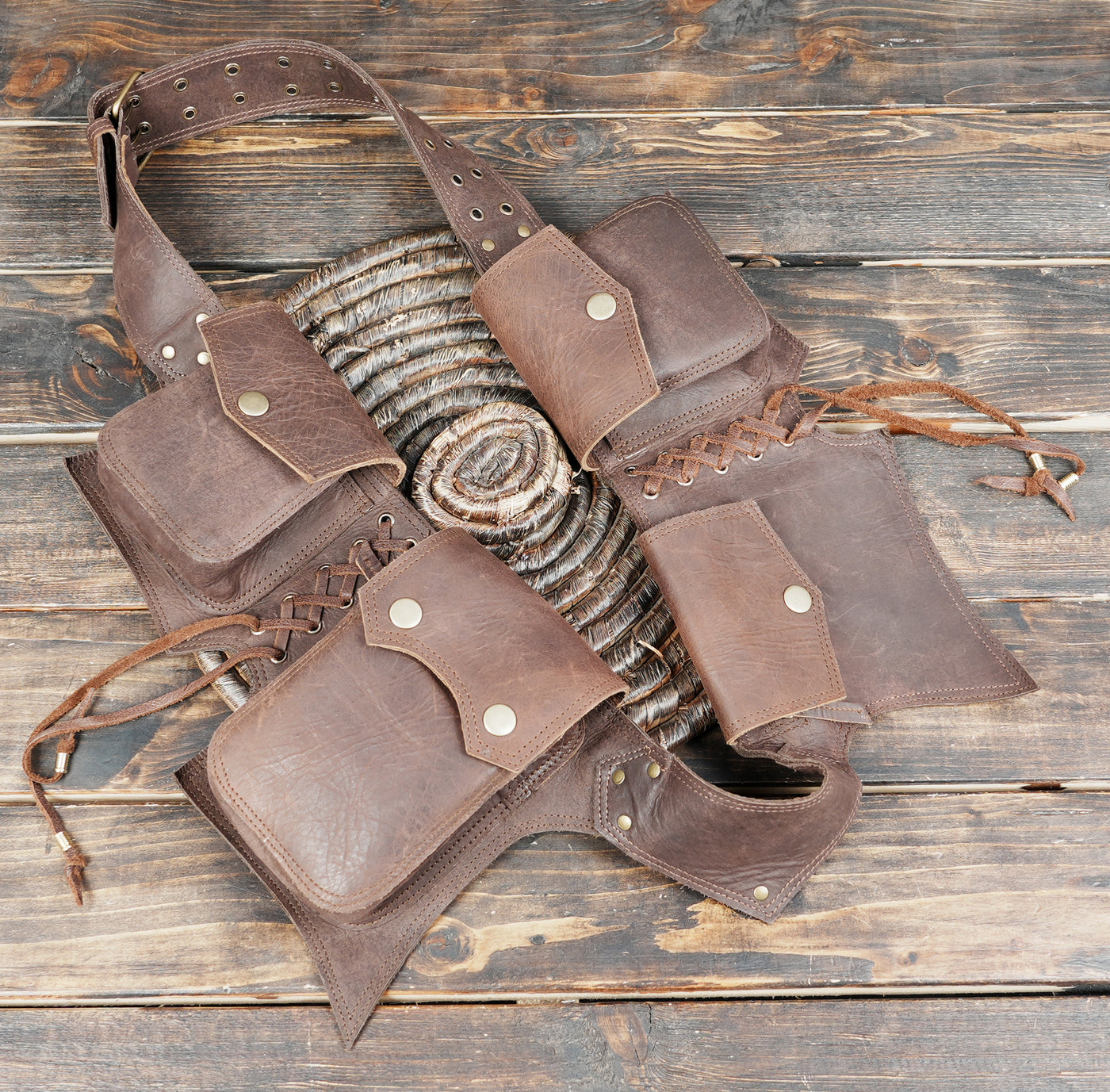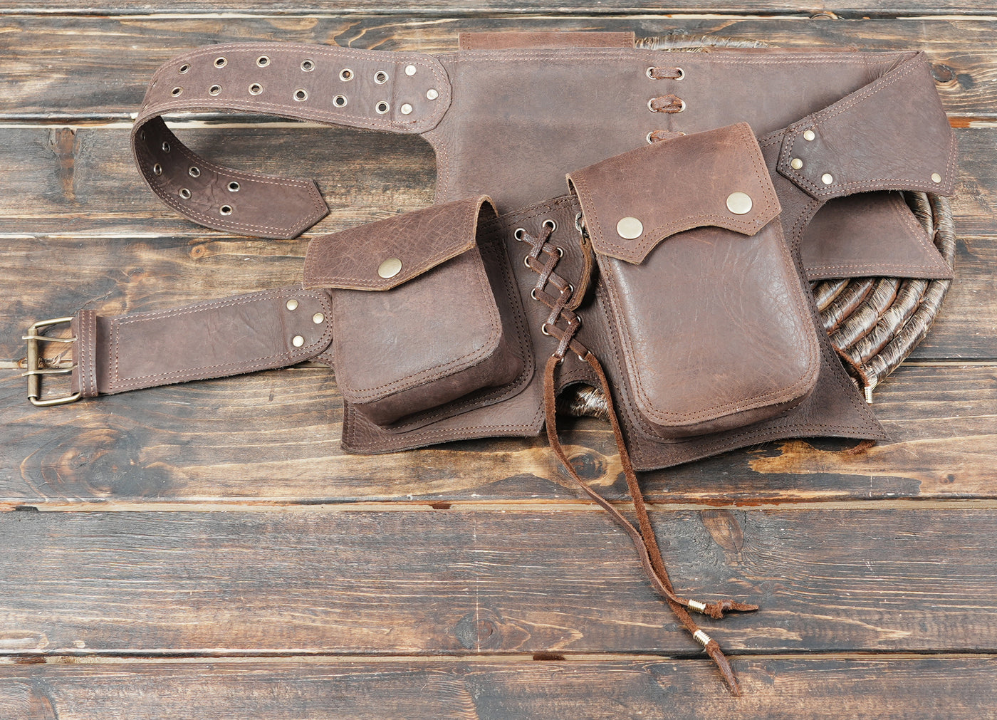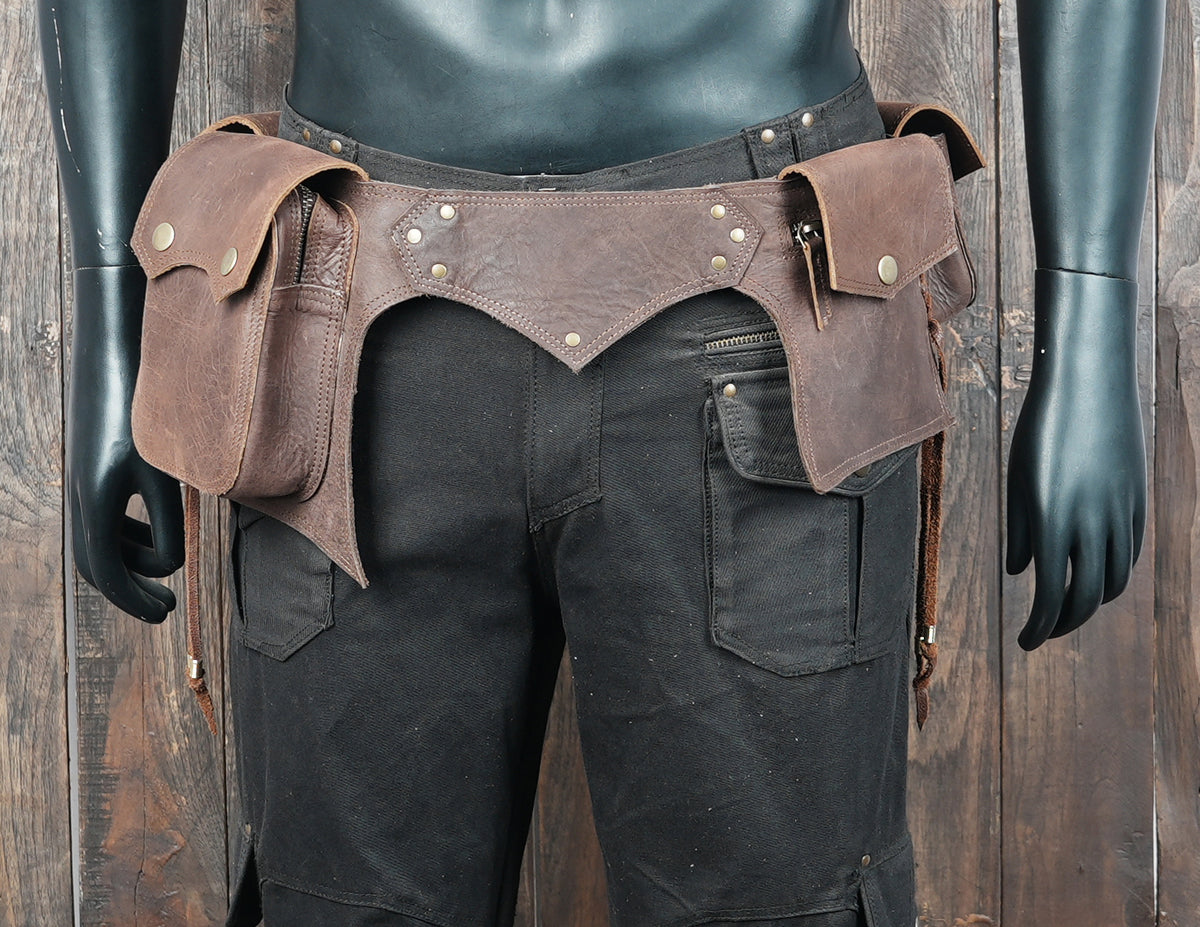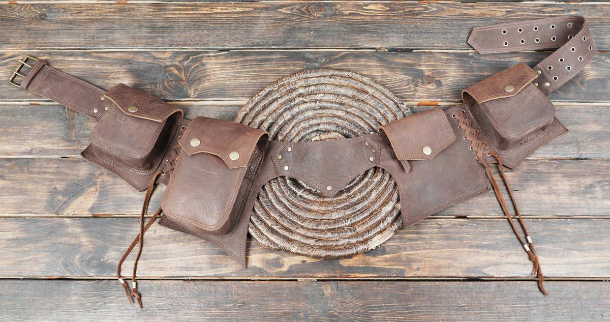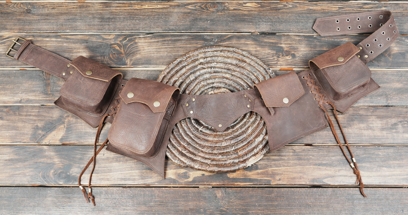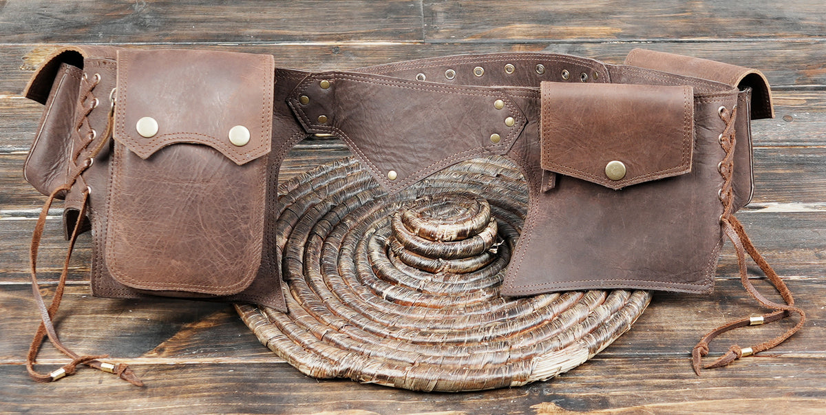 Handmade Leather Waist Belt with Multi Utility Pouches || Boho Style Leather Utility Waist Belt with Storage (LT/AB/WB/6034) - Dark Brown / S = 28 to 32 / Antic Brass