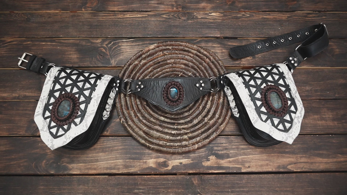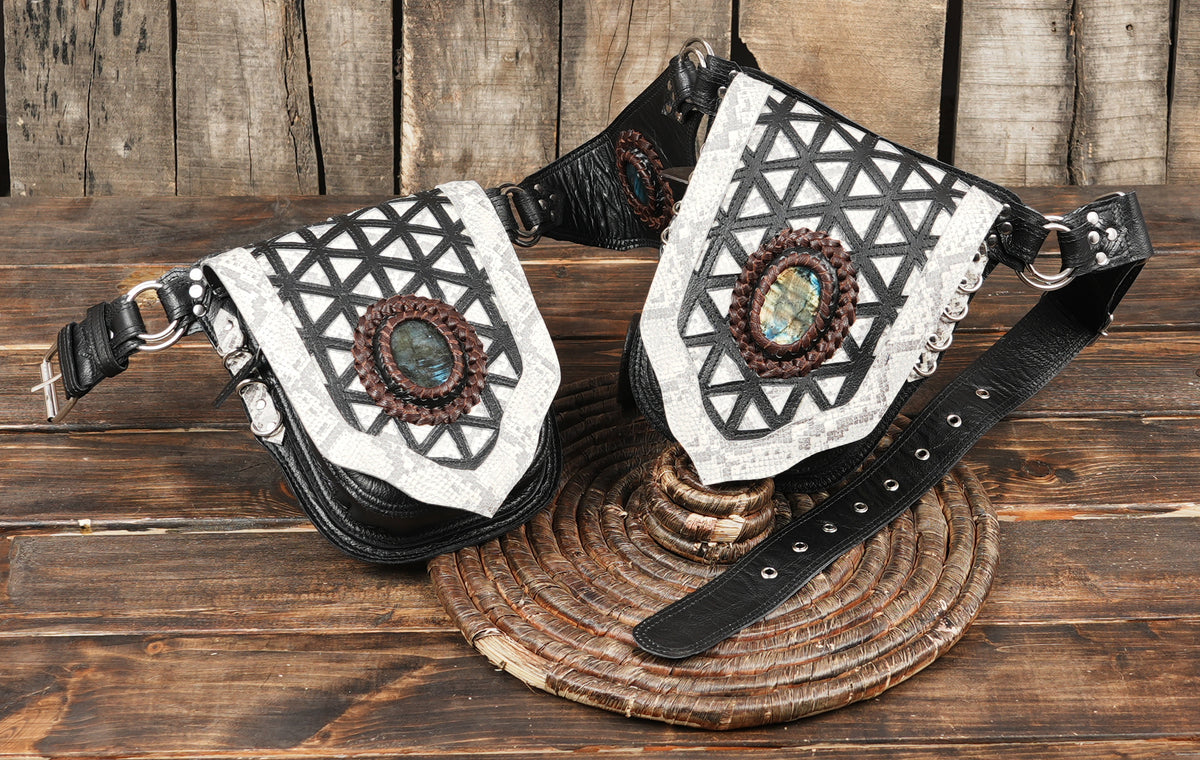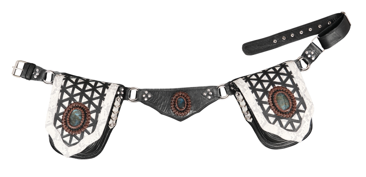 Handmade Tribal Leather Waist Belt with Stone Detail || Boho Style Leather Waist Belt with Decorative Pouches (LT/NS/WB/6049) - Black / S = 28 to 32 / Antic Brass