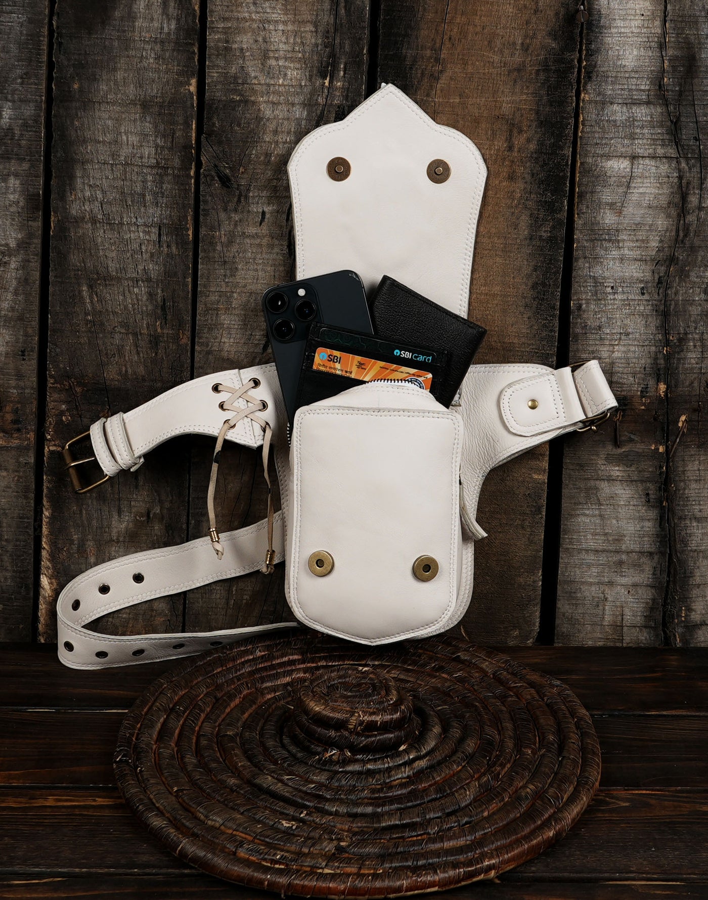 This handmade genuine leather waist belt is expertly crafted from premium white leather with durable stitching for long lasting strength. A natural gemstone centerpiece adds a unique, mystical touch, while the unisex design makes it suitable for both men and women. Perfect for festivals, Burning Man, concerts, cosplay, and everyday adventures, it blends bold style with practical, wearable function.