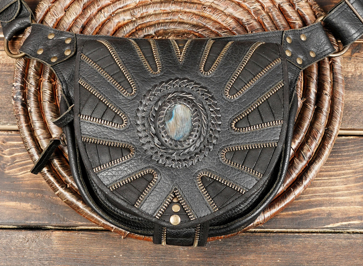 Handcrafted Black Leather Waist Belt with Stone Center || Boho Steampunk Leather Hip Belt with Oval Gem Detail(LT-AB-WB-6012) - Black / S (28 to 32) / Antic Brass