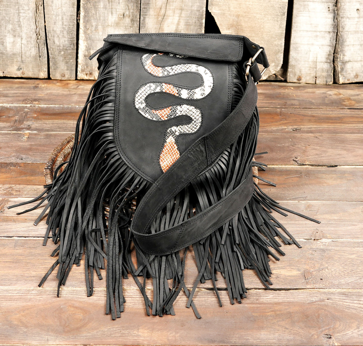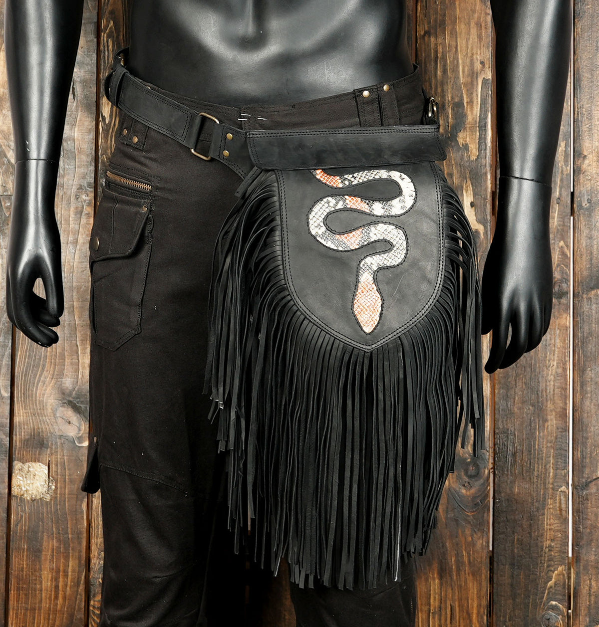 This premium leather piece is crafted from durable, high quality leather for long lasting use. A bold snake design on the flap adds an edgy statement, while long leather fringe detailing brings a boho western vibe. The adjustable waist strap with buckle ensures a secure and comfortable fit, and the versatile design pairs easily with jeans, dresses, or casual outfits across a range of waist sizes.
