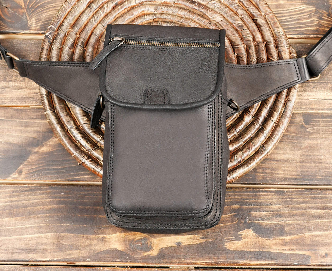 Handmade Black Leather Waist Belt with Zipper Pouch || Leather Waist Belt Bag for Travel and Daily Use (LT-AB-WB-6204) - Black / S - 28 TO 32 / Antic Brass