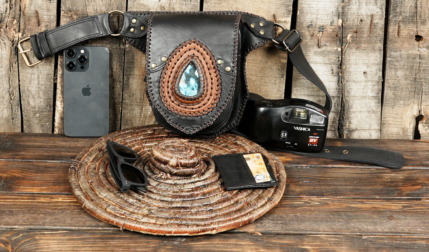 This handmade leather waist pouch is crafted from high-quality leather with fine stitching that adds durability and strength. A natural blue gemstone sits at the center, framed by layered leather and rivets that create a bold tribal look. The compact pouch provides enough space for essentials like your phone, wallet, cash, cards, and keys. The adjustable waist strap includes a buckle with multiple holes, making it easy to get a secure and comfortable fit. Its unisex tribal style works well for anyone who likes boho, steampunk, or gothic fashion.