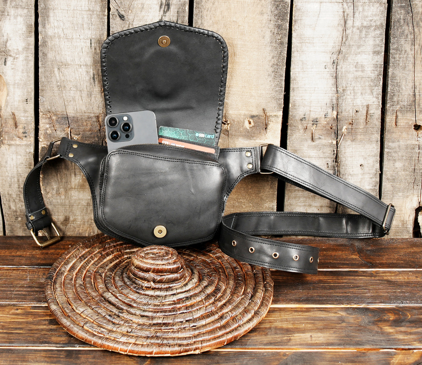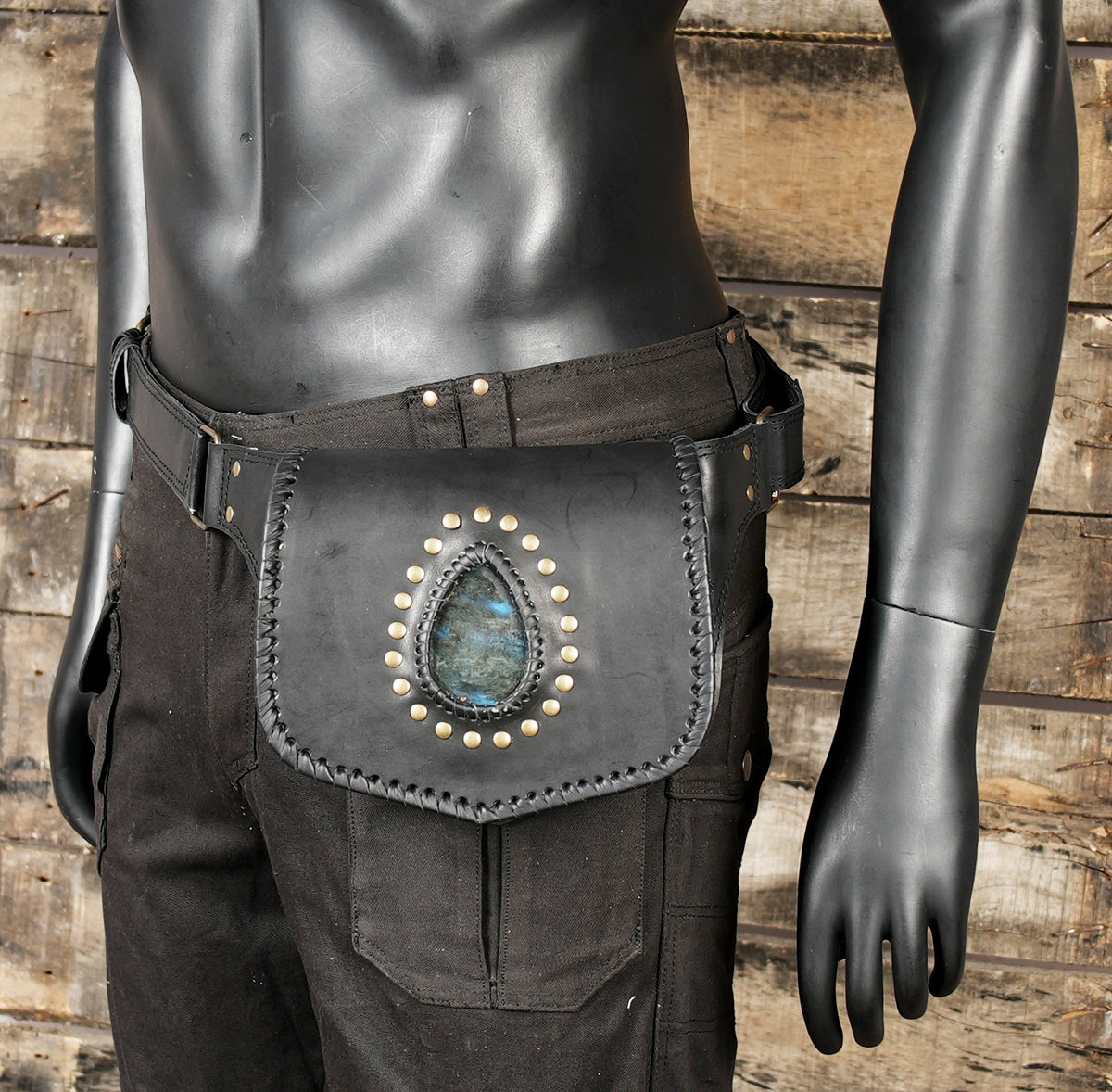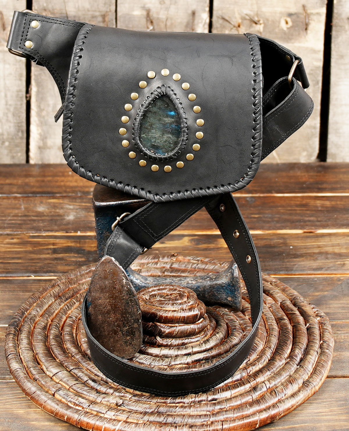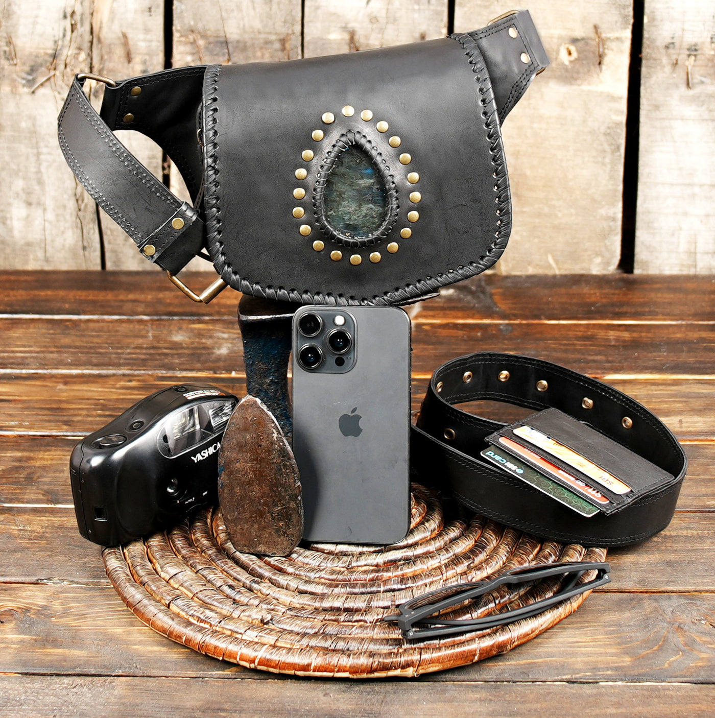 This piece is made from genuine leather and finished with durable stitching, so it holds up well with regular use. A natural stone sits at the center, framed with brass studs that give it a tribal, slightly mystical feel. The buckle strap adjusts easily to fit different waist sizes, so it stays comfortable all day. The main pocket is roomy enough for your phone, wallet, keys and other small essentials, keeping everything secure and easy to reach.