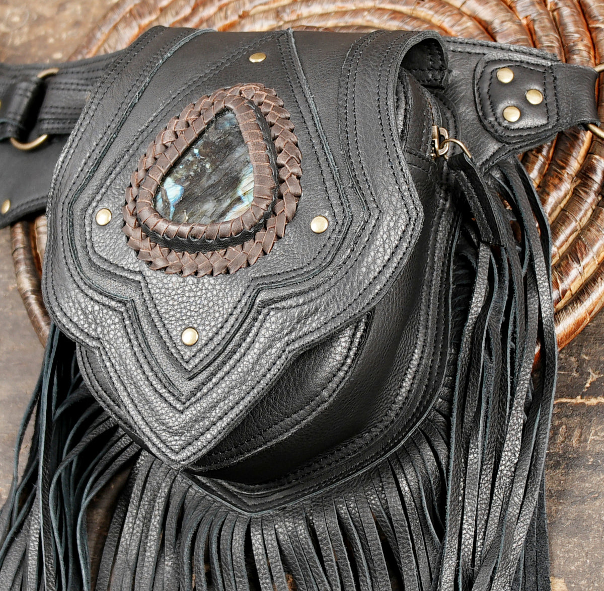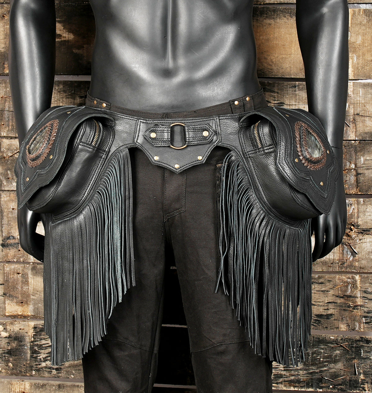 Handcrafted Leather Waist Belt with Dual Pouches and Gemstones || Boho Leather Waist Belt with Fringe Tassels For Unisex (LT/AB/WB/6190) - Black / S - 28 TO 32 / Antic Brass