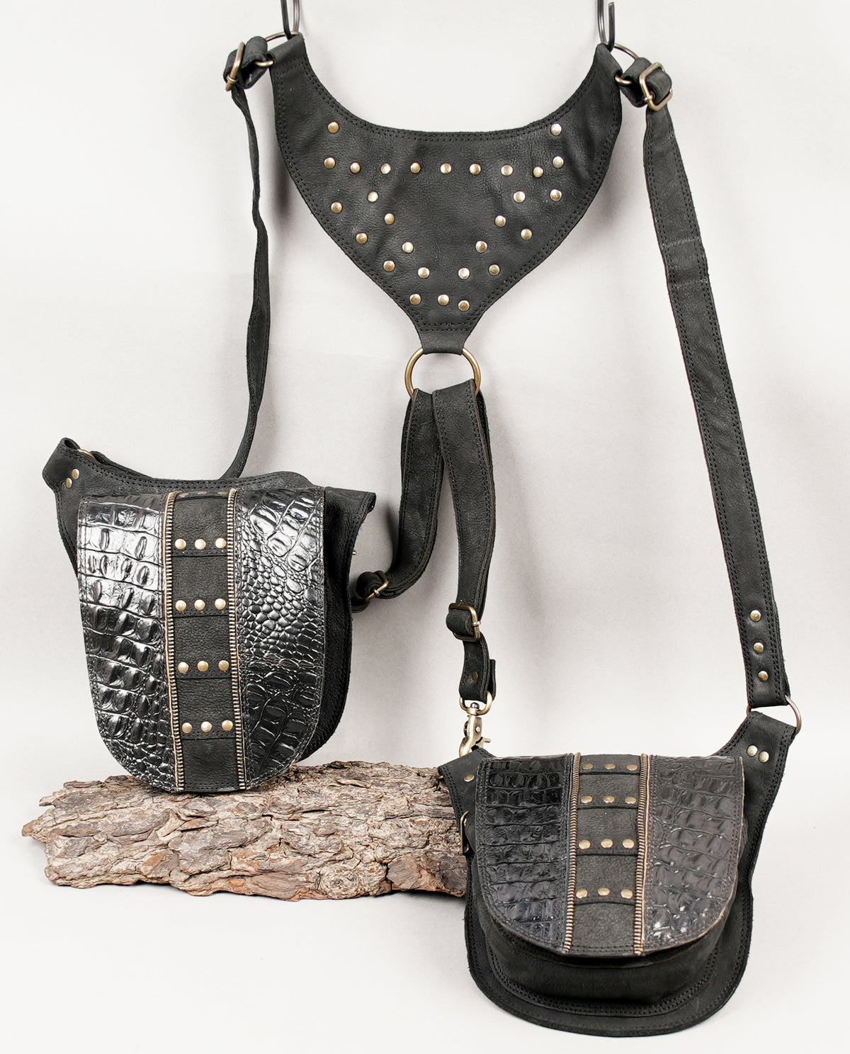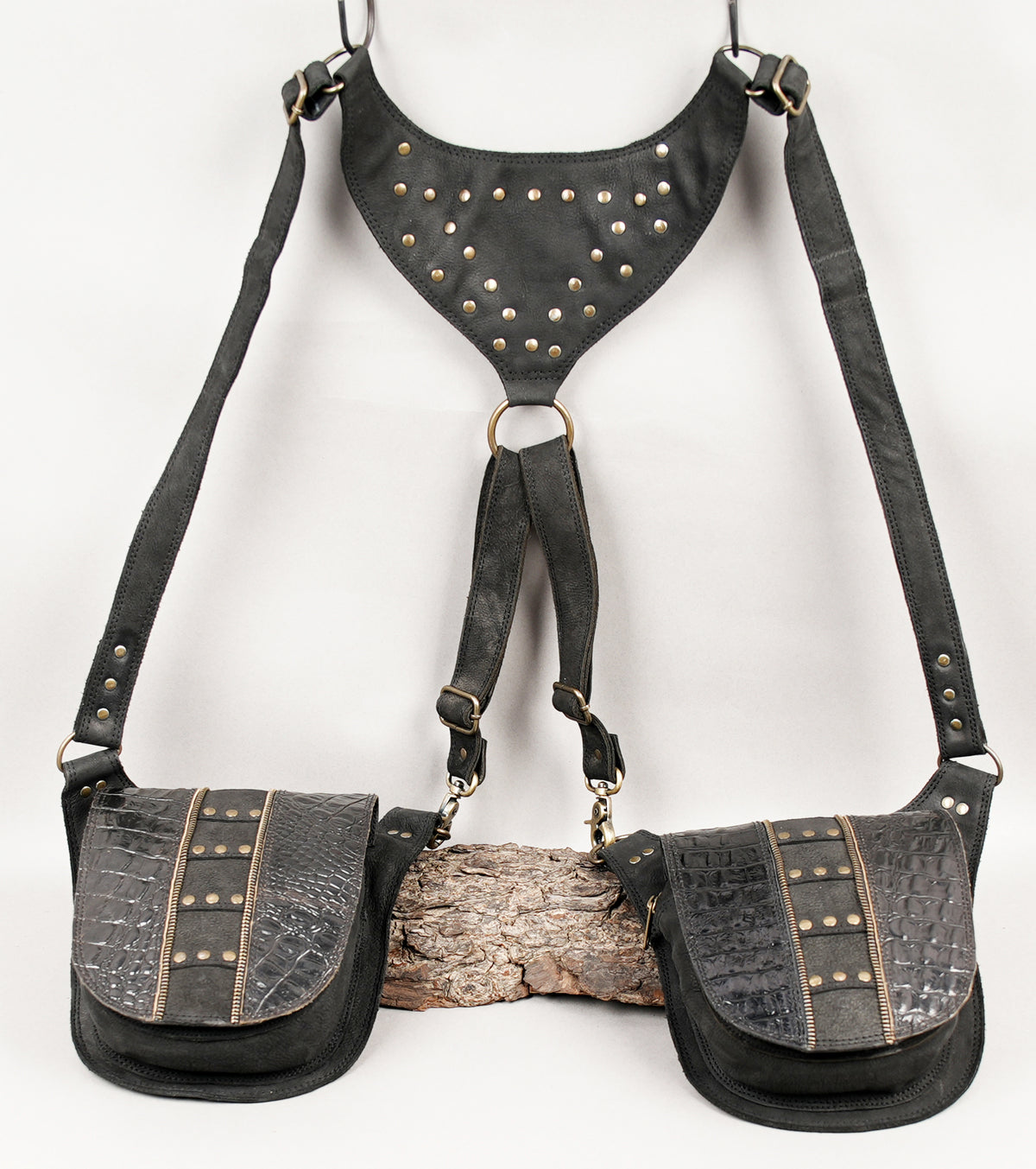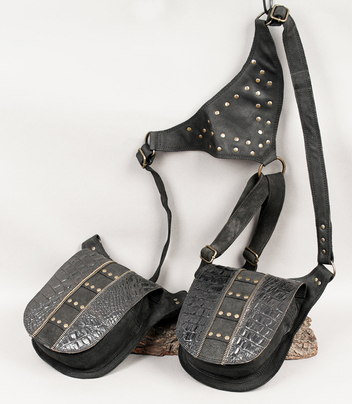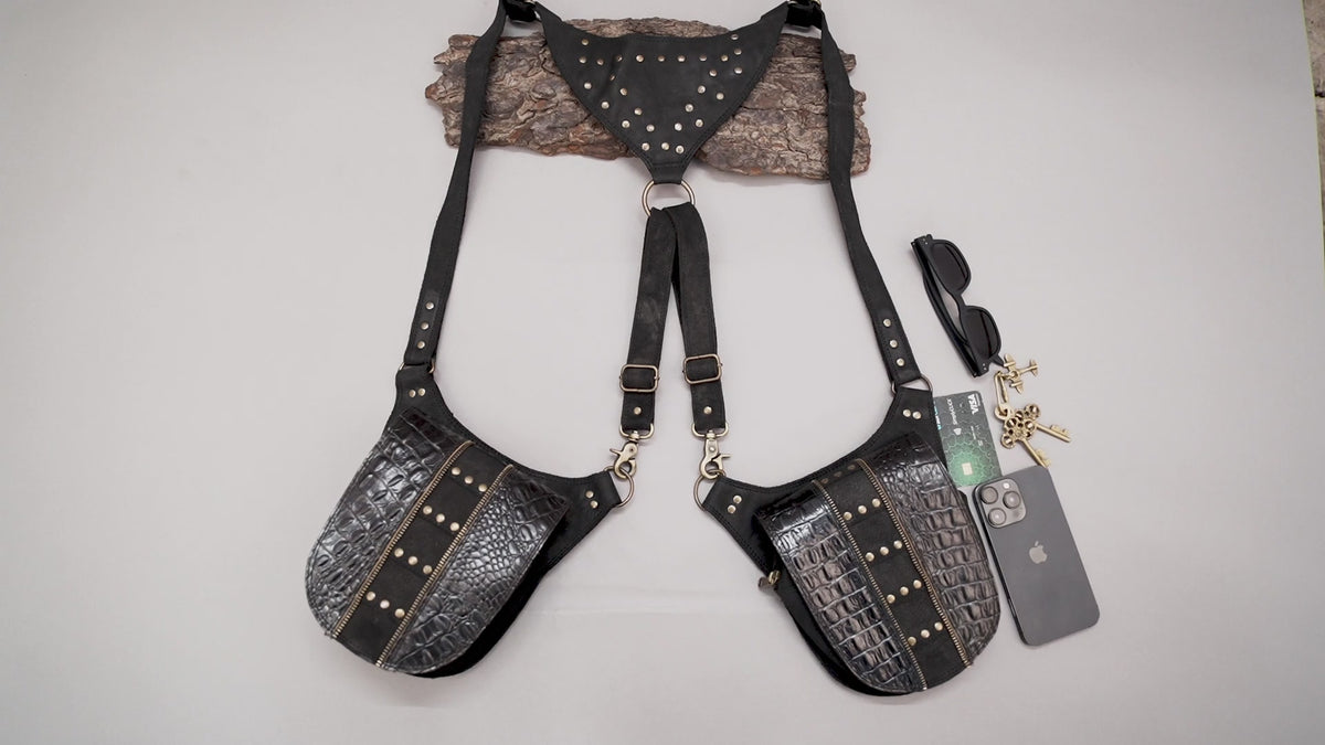 This premium black leather shoulder holster features dual crocodile-textured pouches, reinforced with metal studs and brass hardware for durability and style. The adjustable shoulder straps ensure a comfortable, secure fit, while the spacious zippered pockets provide easy access to essentials. Designed for hands-free convenience, this holster is perfect for travel, festivals, outdoor activities, and everyday use, offering a bold and functional accessory with a unique designer look.