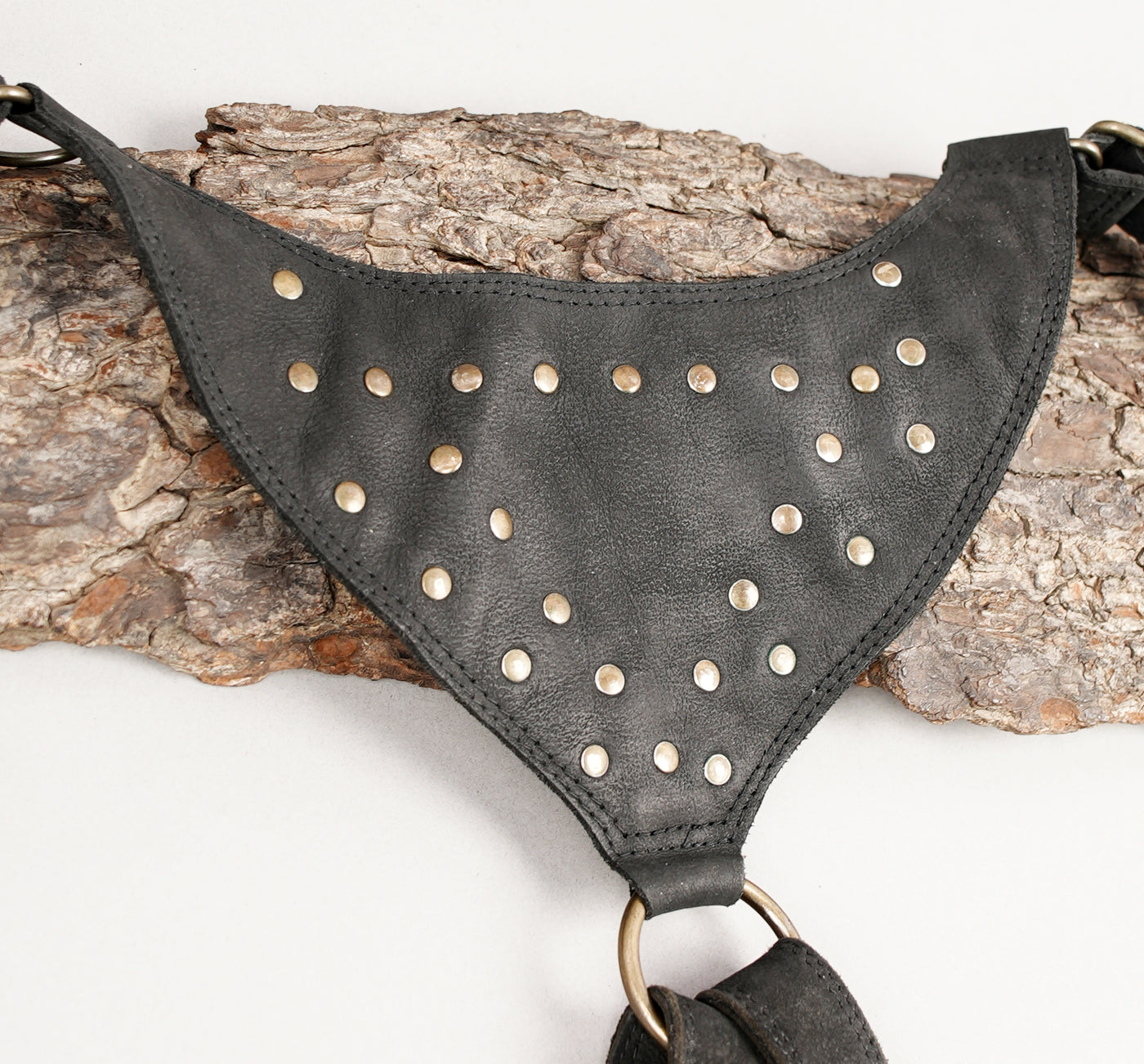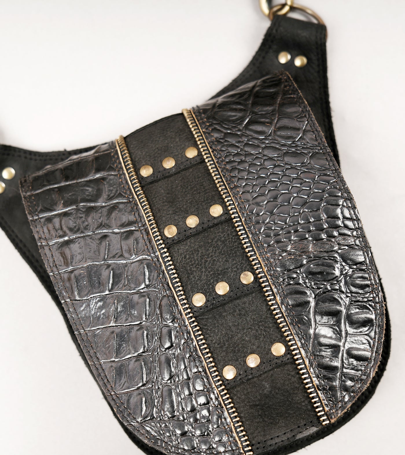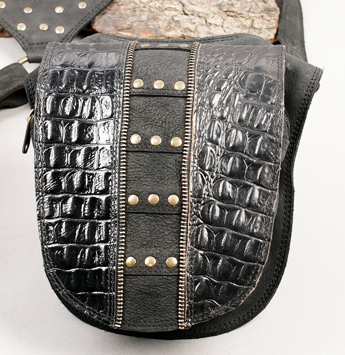 This premium black leather shoulder holster features dual crocodile-textured pouches, reinforced with metal studs and brass hardware for durability and style. The adjustable shoulder straps ensure a comfortable, secure fit, while the spacious zippered pockets provide easy access to essentials. Designed for hands-free convenience, this holster is perfect for travel, festivals, outdoor activities, and everyday use, offering a bold and functional accessory with a unique designer look.