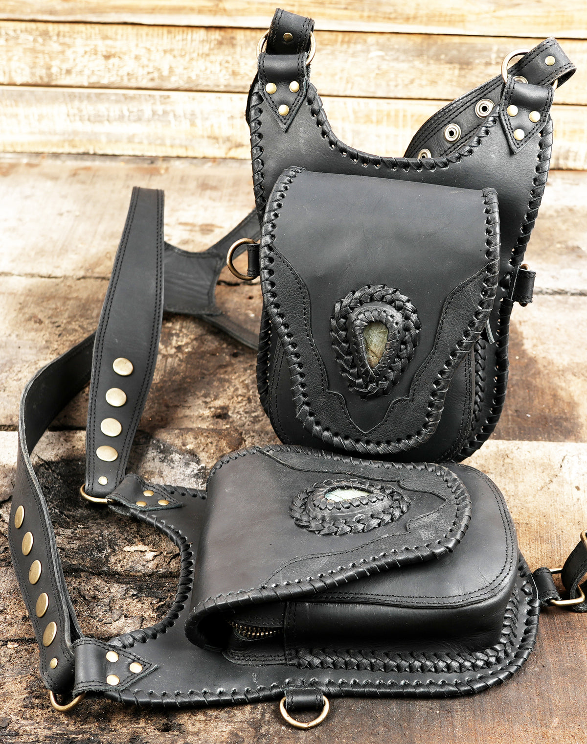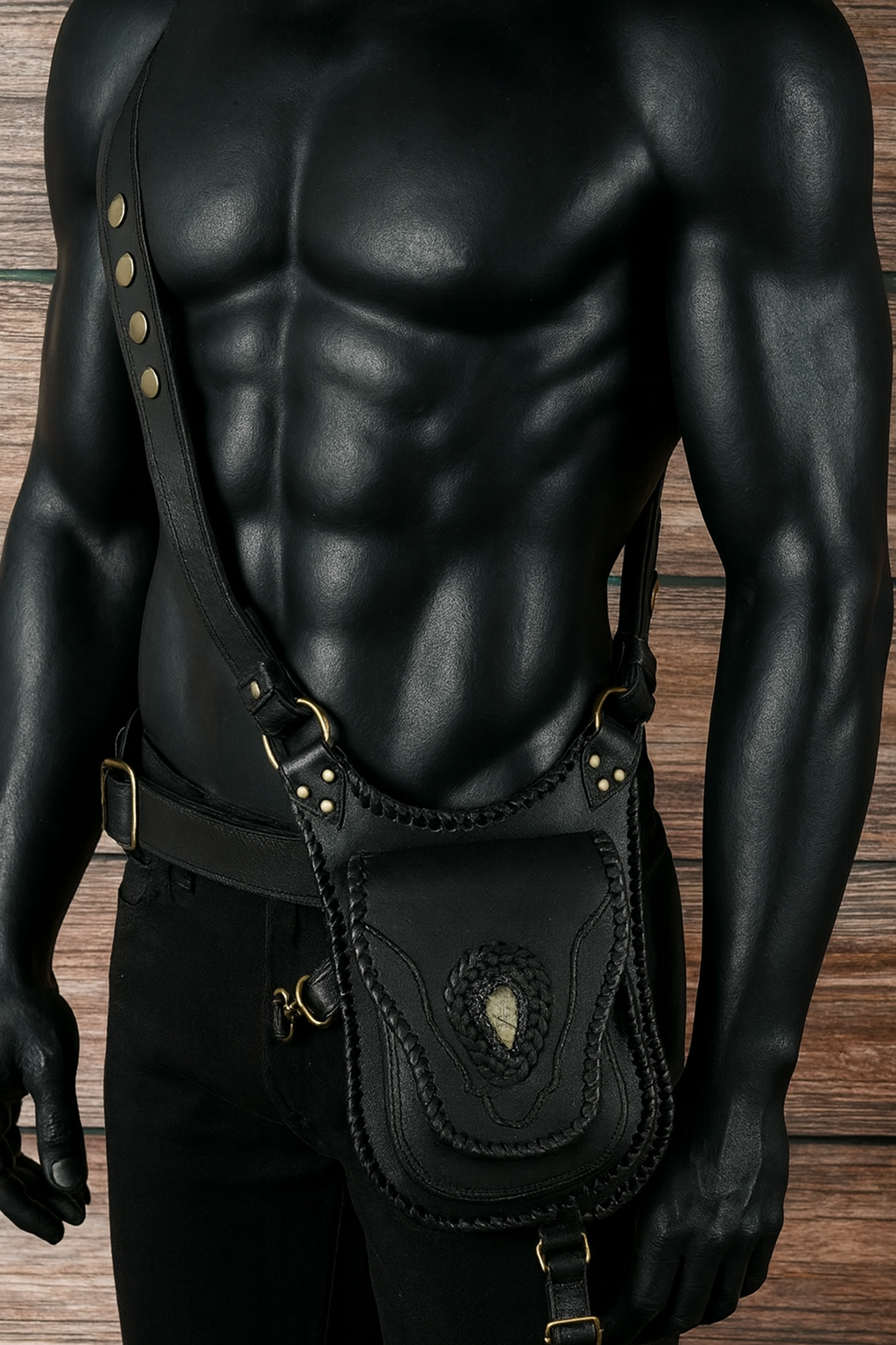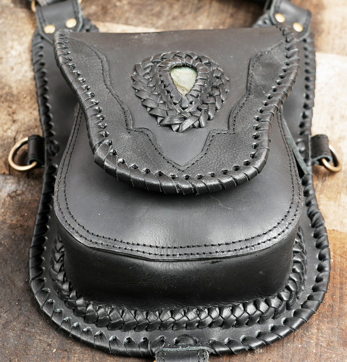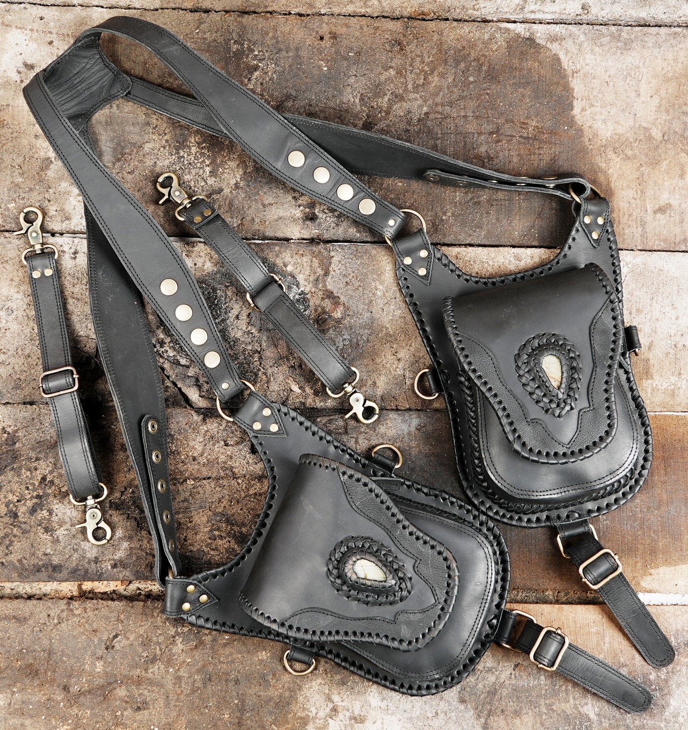 Crafted from high-quality black leather, this dual-pouch holster features detailed hand-stitched edging, decorative front flap accents, and a secure gemstone-style centerpiece for a bold, stylish look. The adjustable shoulder and side straps ensure a comfortable, customizable fit, while the spacious flap pockets provide safe storage for essentials. Designed for festivals, travel, biking, or hands-free daily carry, this unisex holster offers durability, functionality, and standout craftsmanship.