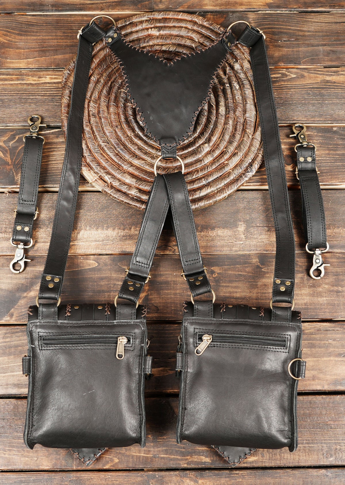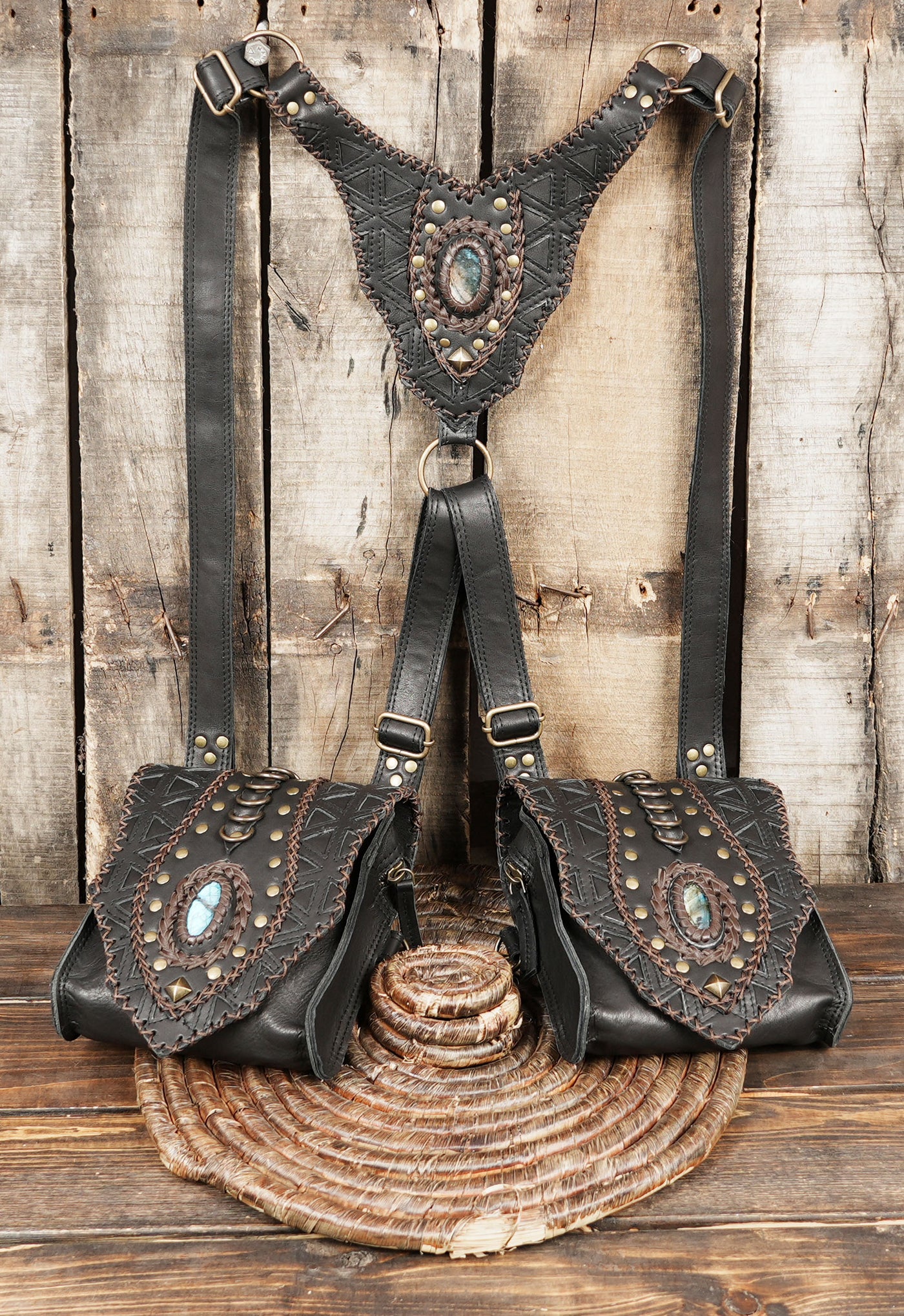 Black Leather Holster Harness With Labradorite Gemstone || Geometric Pattern Leather Holster Bag Set || Festival Black Leather Holster (LT/AB/HLS/6010) - Black / Free Sized