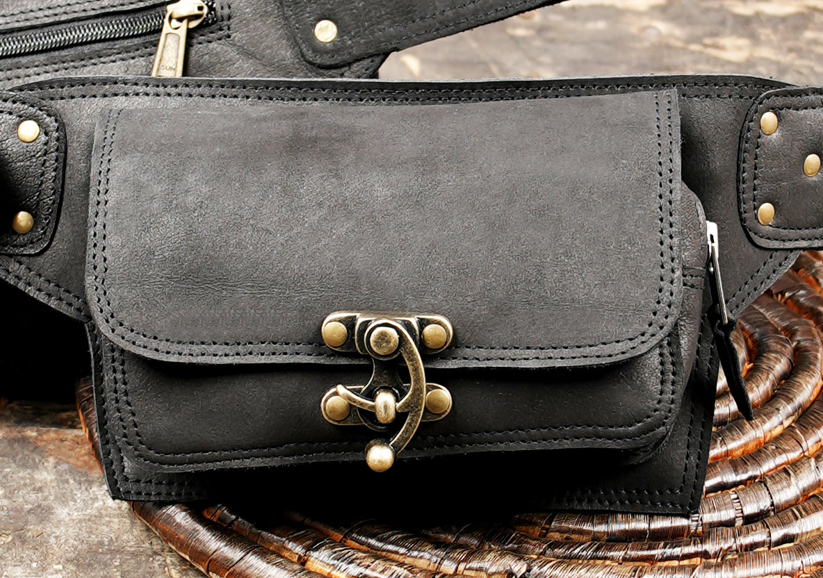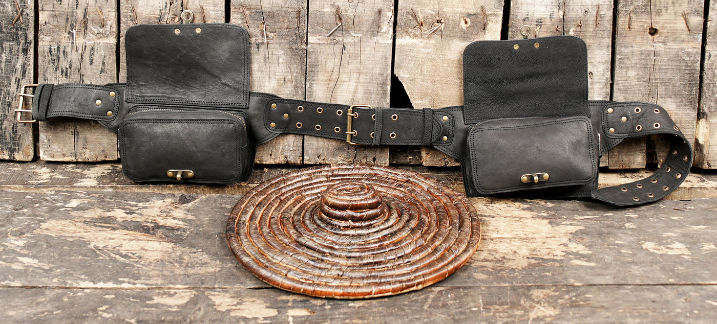 Black Leather Utility Waist Belt with Dual Pouches || Adjustable Black Leather Festival Belt with Double Pouches (LT/AB/WB/6018) - Black / S = 28 to 32 / Antic Brass