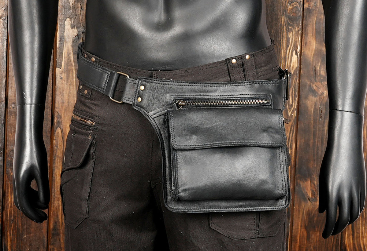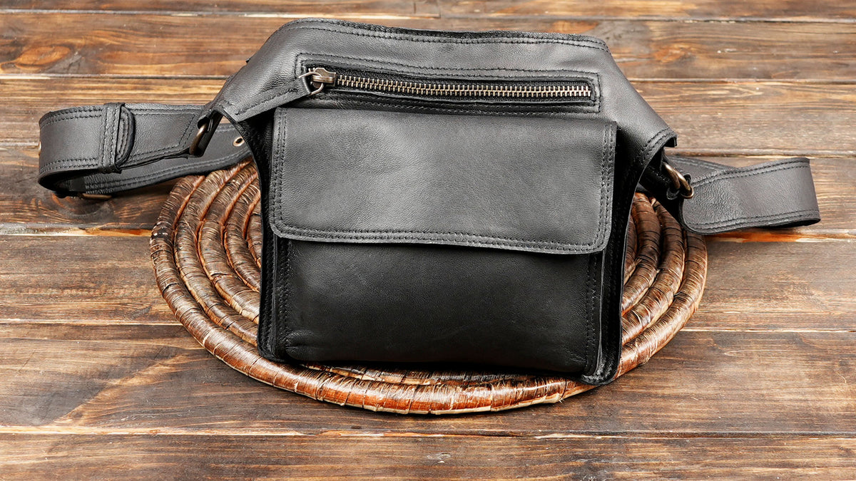 Black Leather Waist Belt Bag with Front Zipper Pocket || Genuine Leather Hip Pouch with Secure Zip Closure (LT/AB/WB/6030) - Black / S = 28 to 32 / Antic Brass