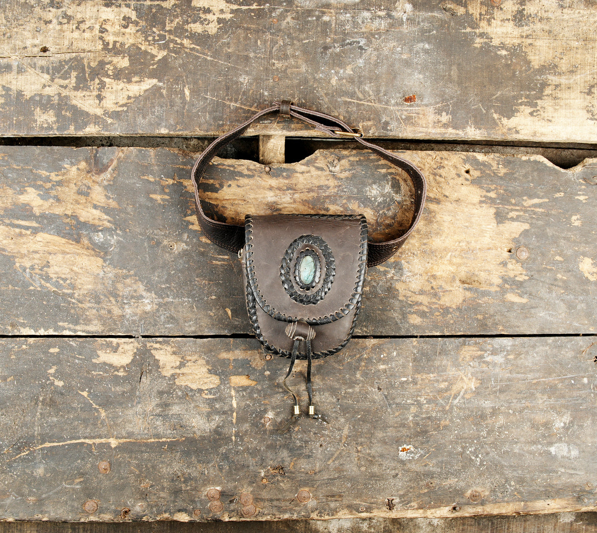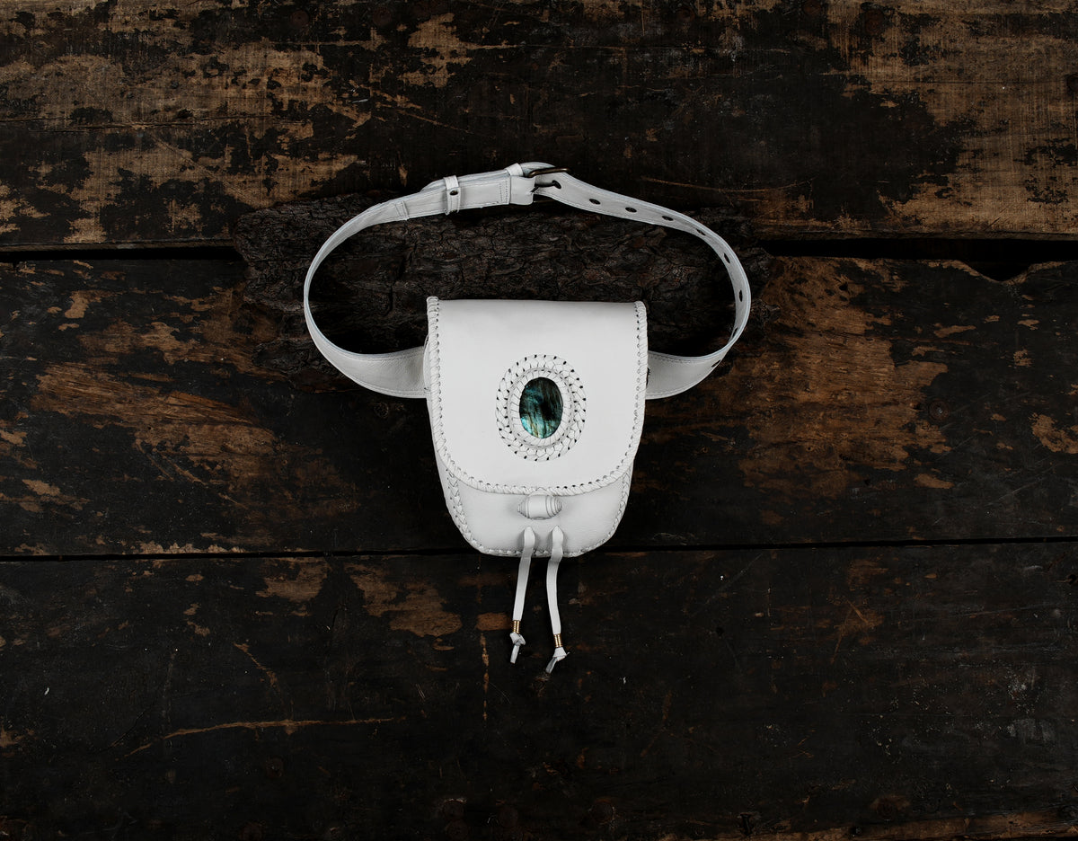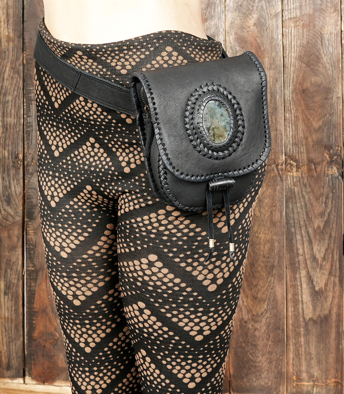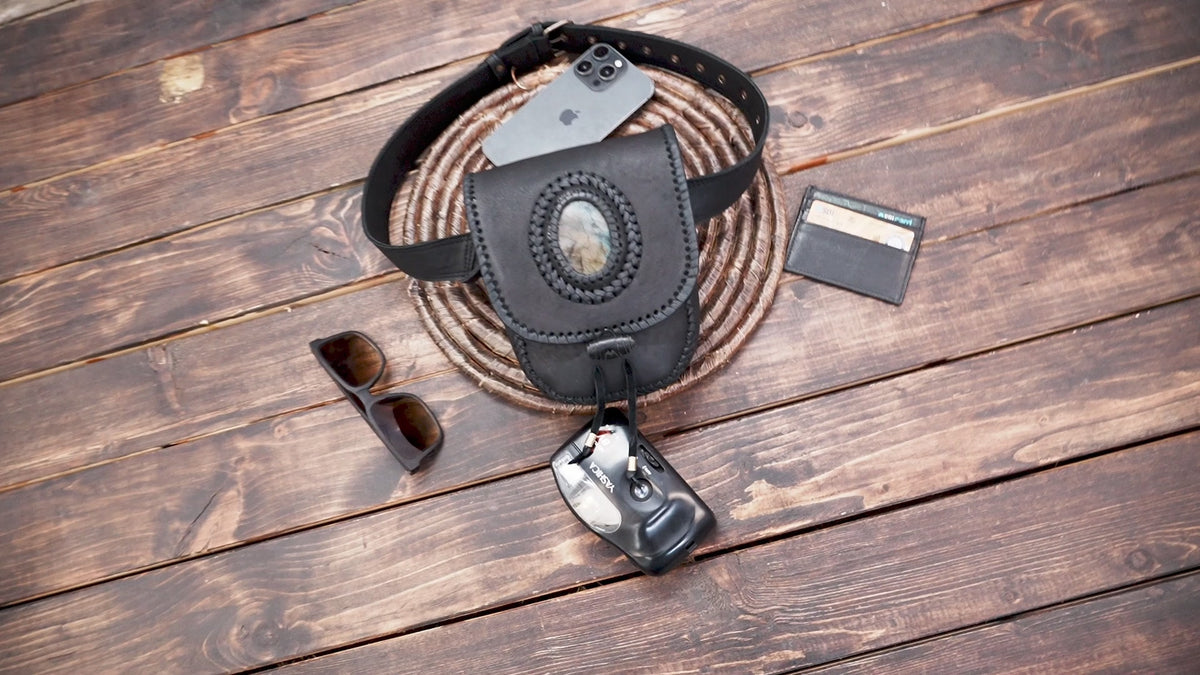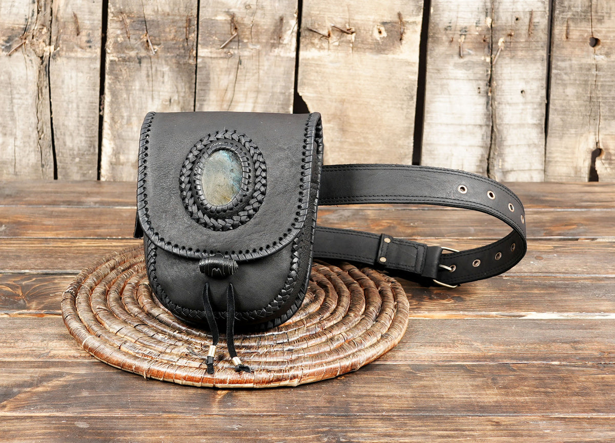 Boho Leather Belt Bag with Gemstone || Multi-Pocket Leather Travel Belt Bag (LT-AB-WB-6093) - Black / S - 28 TO 32 / Antic Brass