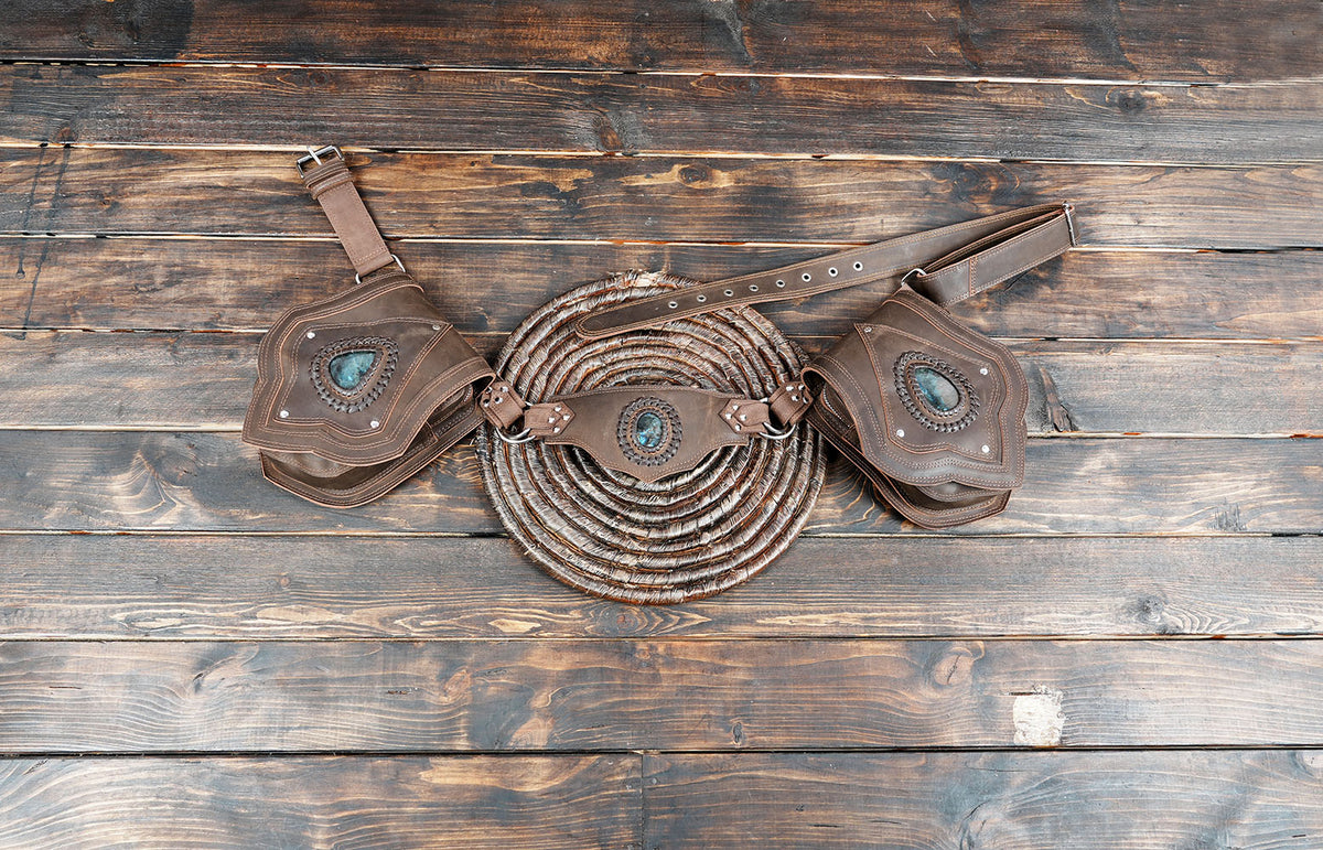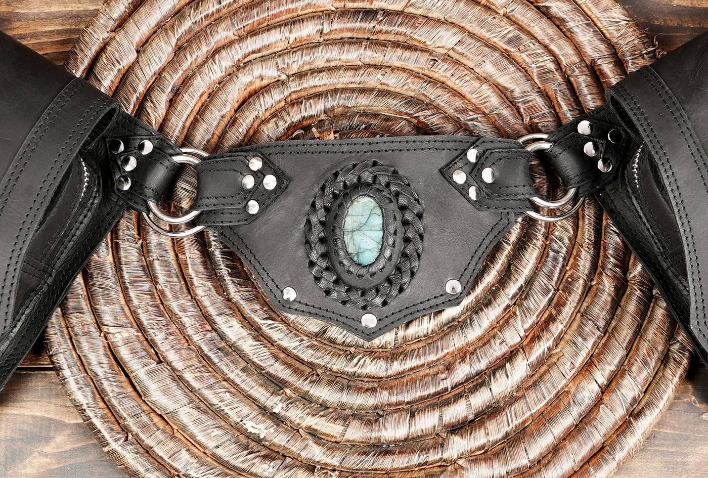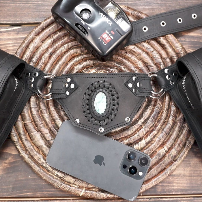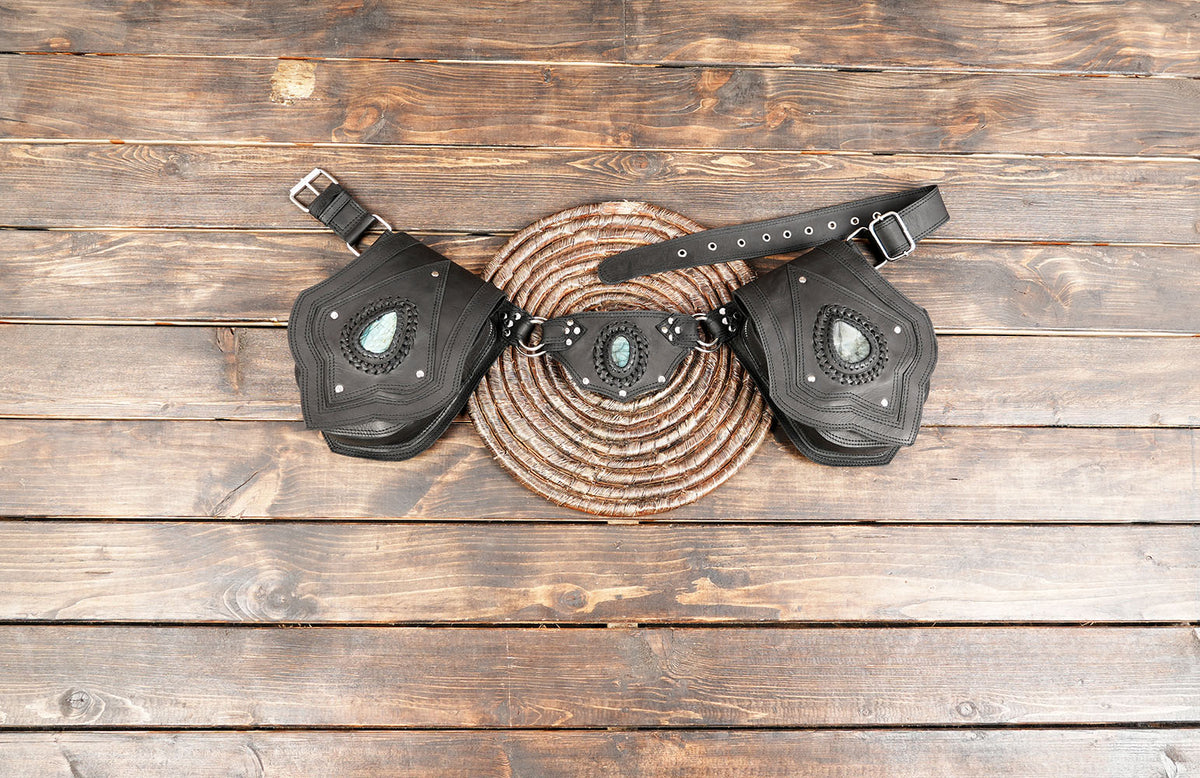 Black Leather Double Pouch Waist Belt with Labradorite Stone || Festival Style Leather Waist Belt with Double Pockets (LT-NS-WB-6025) - Black / S - 28 TO 32 / Antic Brass