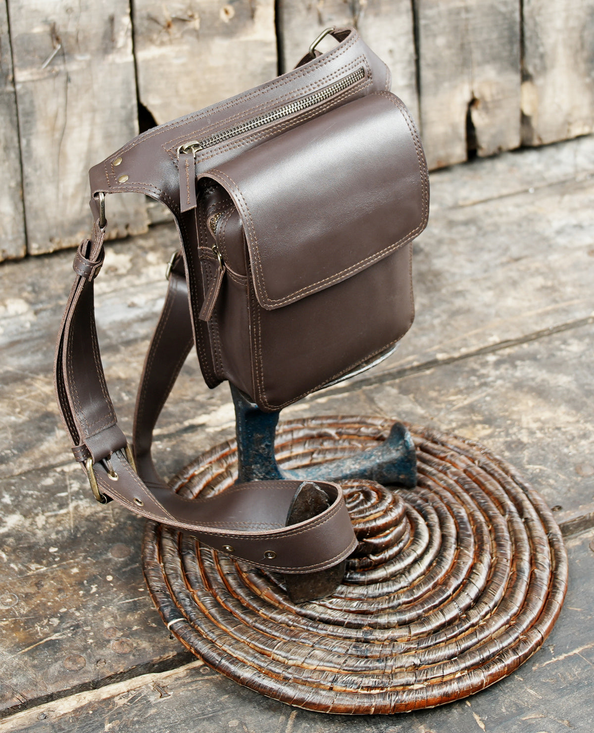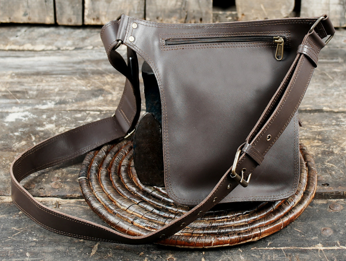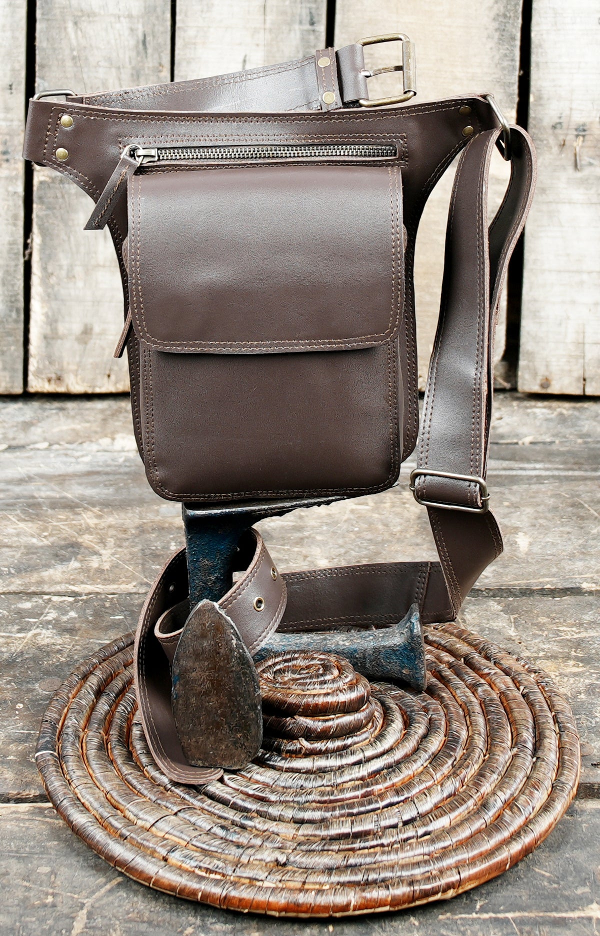 Brown Genuine Leather Waist Belt with Utility Pouch || Handmade Brown Leather Hip Bag with Secure Flap Pocket (LT-AB-WB-6022) - Dark Brown / S = 28 to 32 / Antic Brass