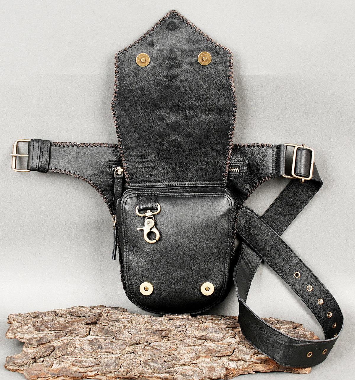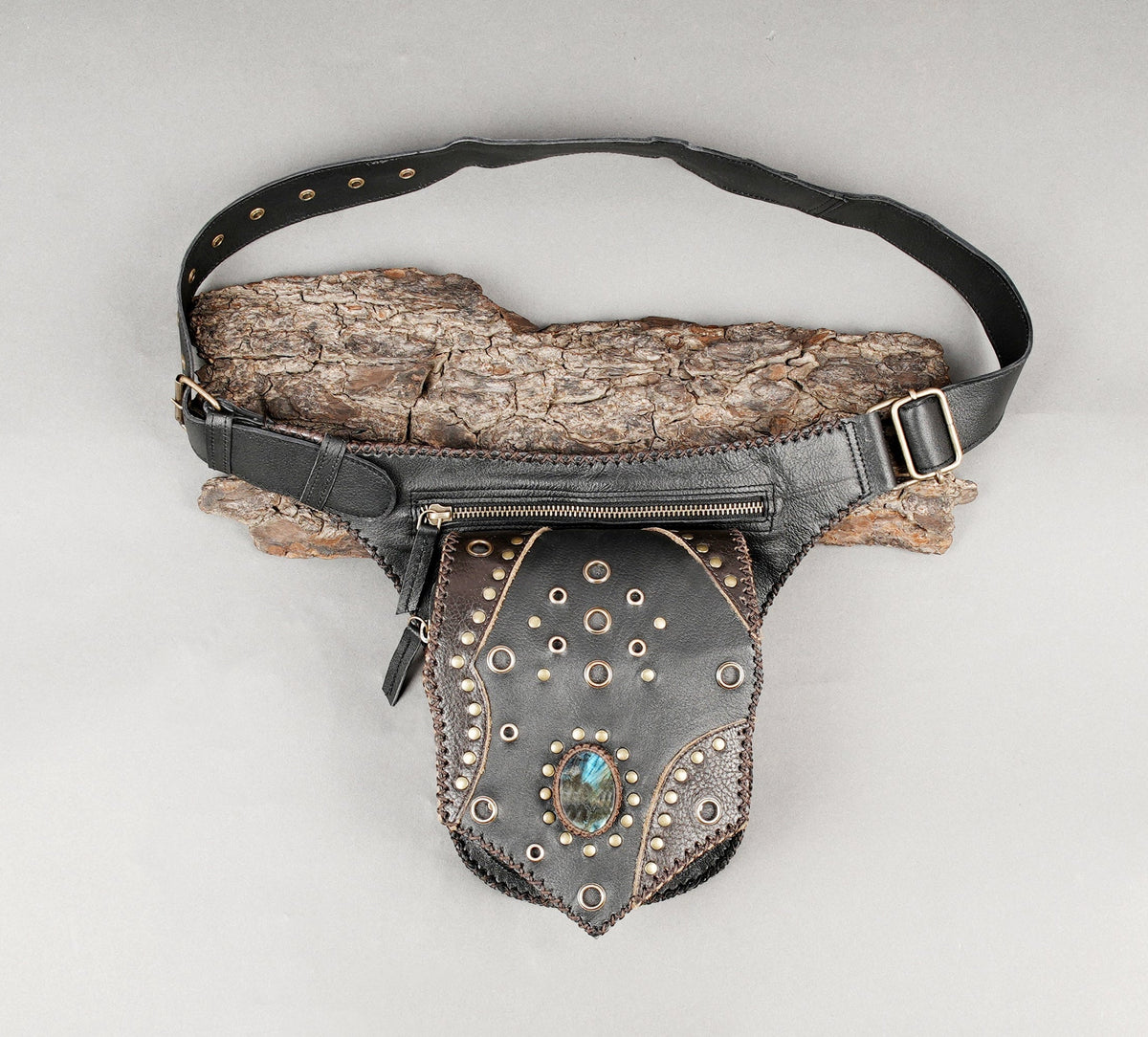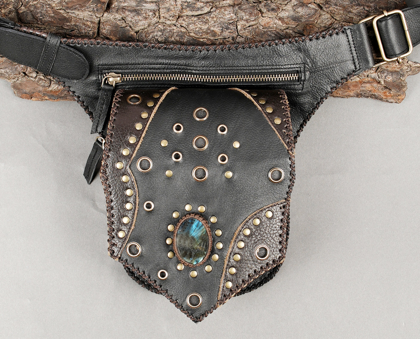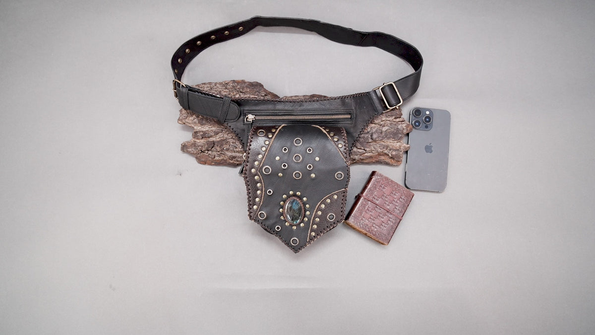 Handcrafted Black Leather Waist Belt with Gemstone Centerpiece || Boho Leather Waist Belt Bag with Stud Detailing and Zipper Pocket (LT/AB/WB/6184) - Black / S = 28 to 32 / Antic Brass