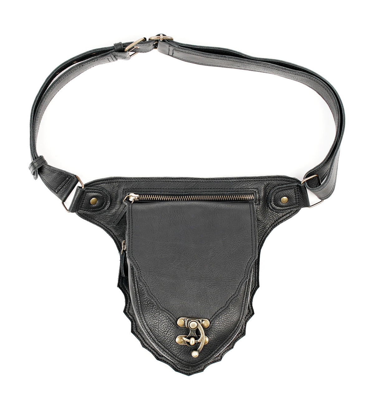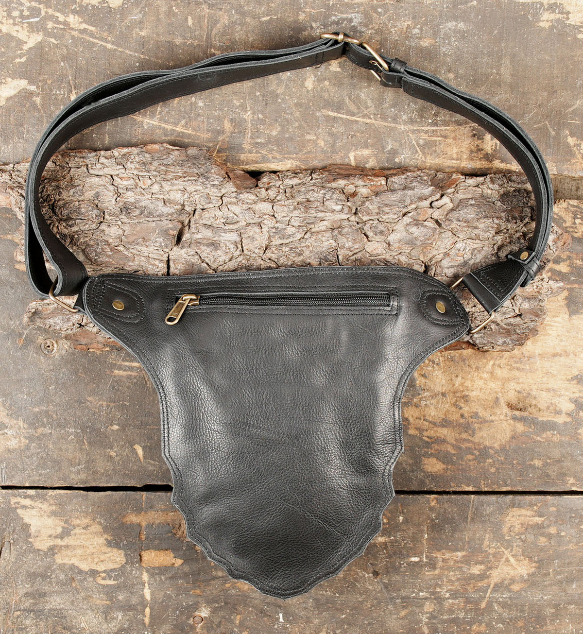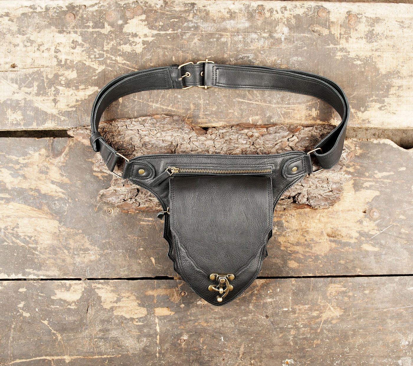 This black leather waist belt is crafted from genuine leather and designed with a practical front pouch that includes a secure zipper and clasp closure for safe storage of small essentials. It features strong stitching, durable metal hardware, and an adjustable strap for a comfortable fit, making it suitable for travel, festivals, outdoor activities, and everyday wear for both men and women.