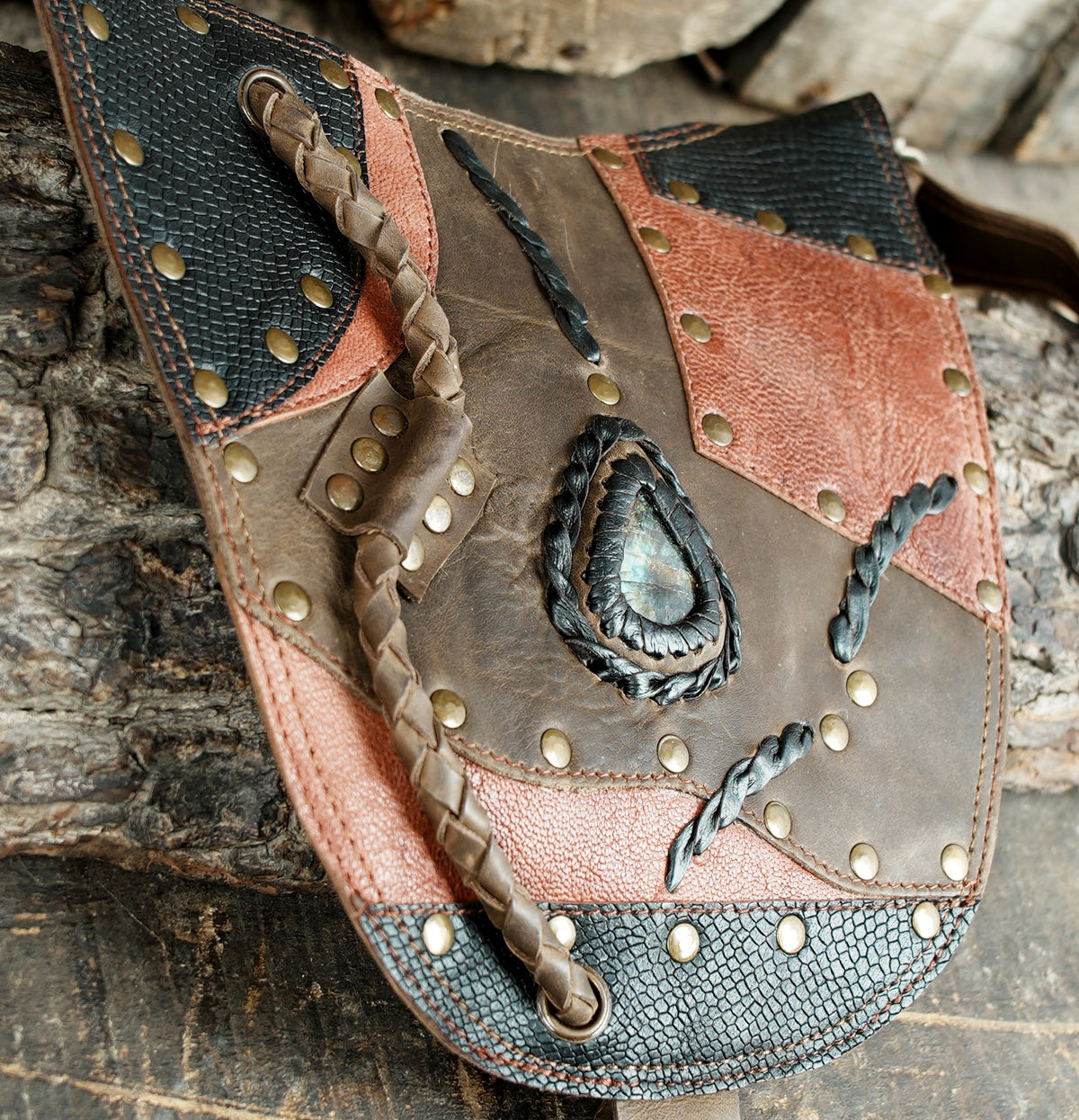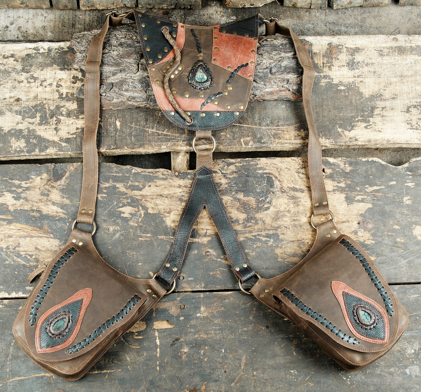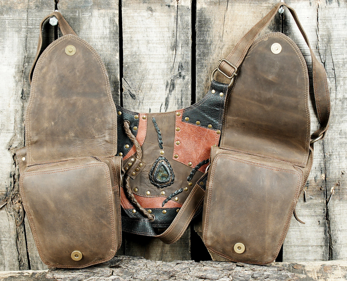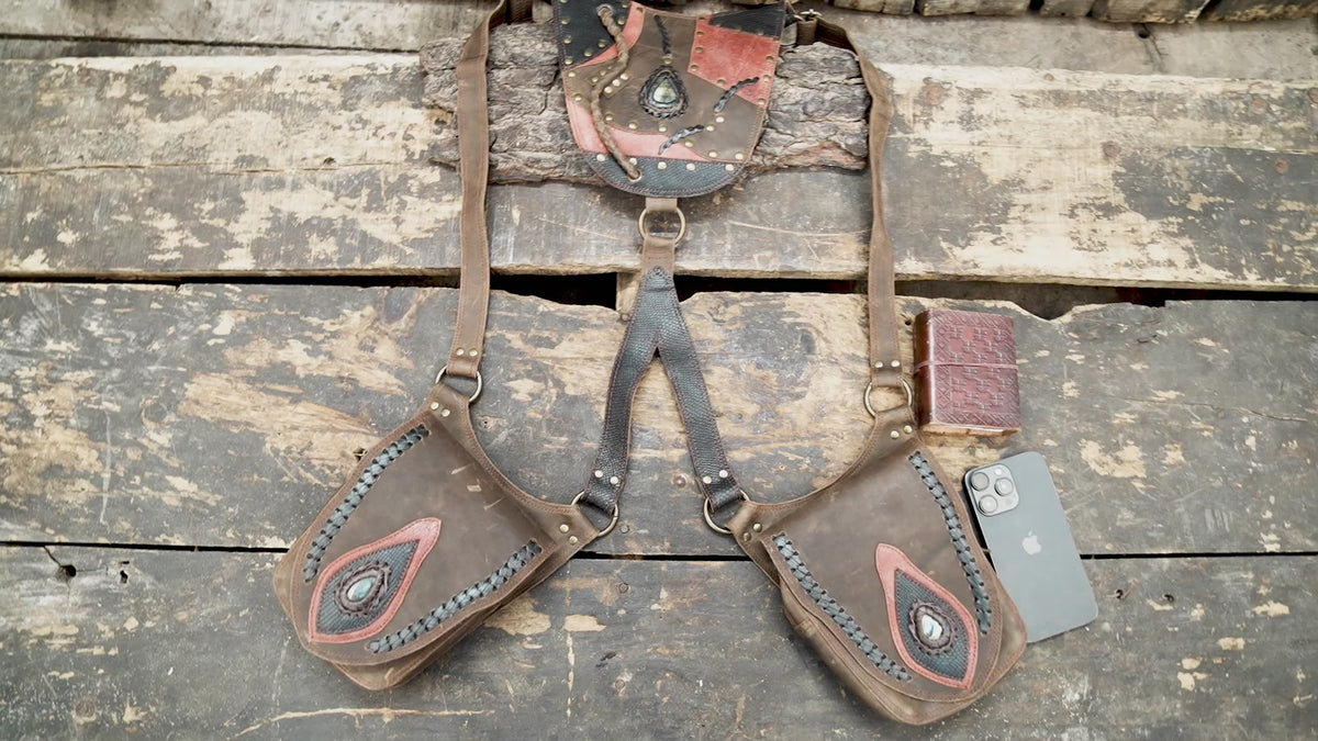 This holster is handmade from genuine leather and designed with stitched tribal-style panels and a gemstone accent for a unique artisan look. It includes two roomy pouches that can hold your daily essentials securely, supported by durable hardware and strong stitching. The adjustable shoulder and waist straps allow a comfortable and customizable fit, making it practical for festivals, travel, cosplay, or everyday hands-free use while adding a rustic, handcrafted touch to your outfit.