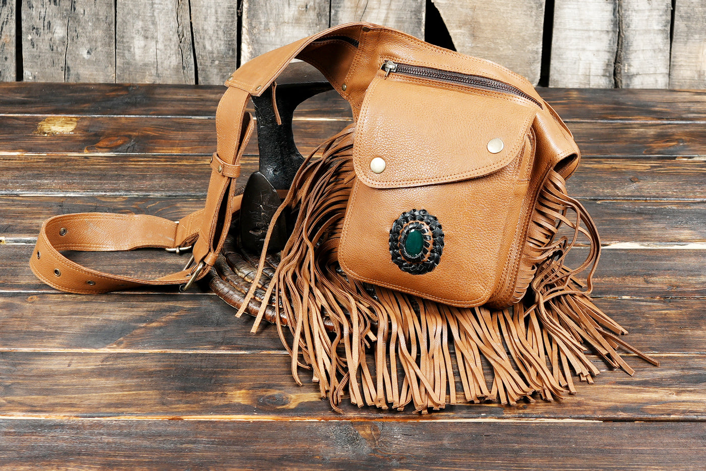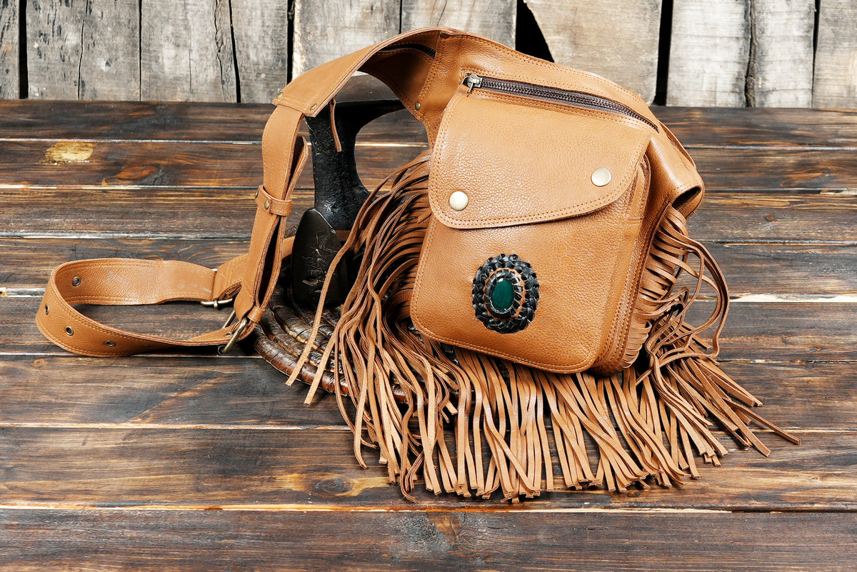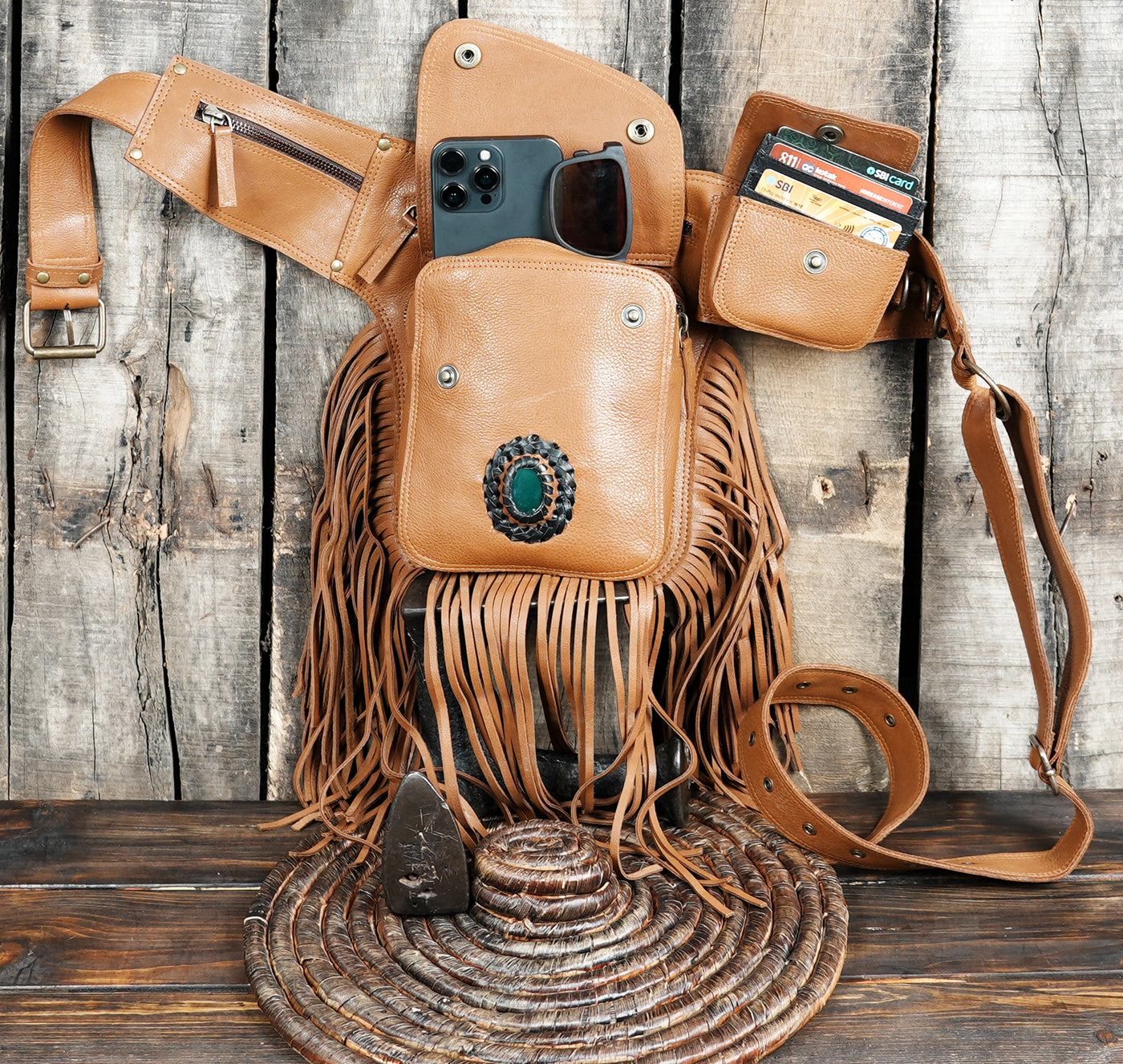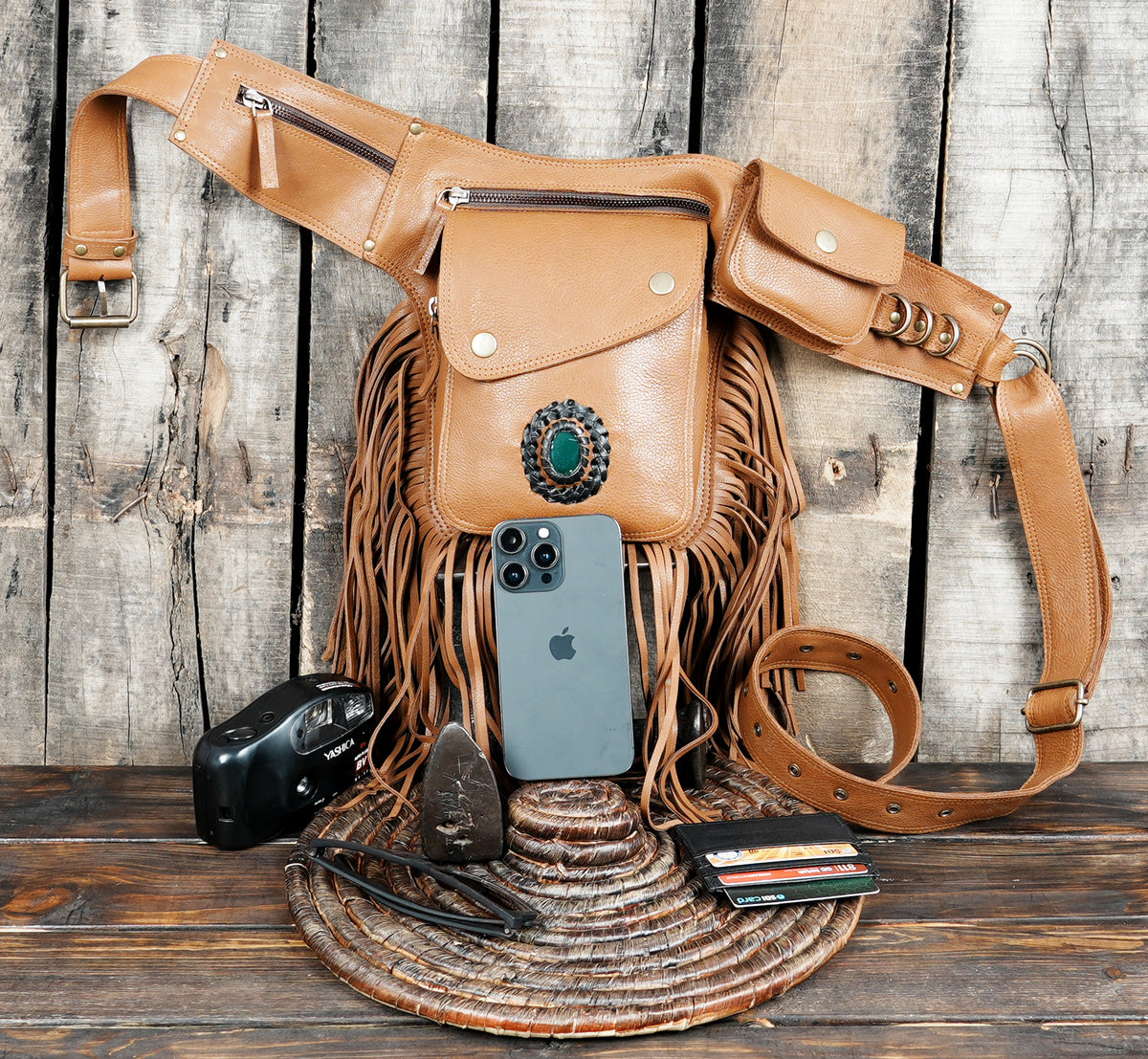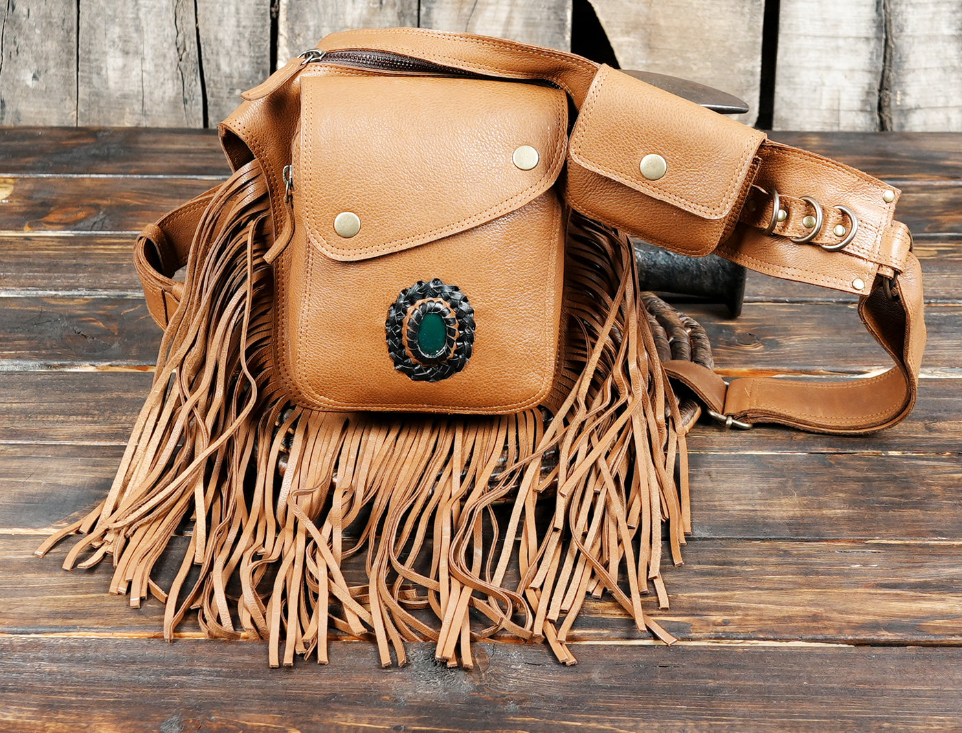 Handcrafted Brown Leather Waist Belt with Fringe and Gemstone || Boho Leather Waist Belt Bag with Utility Pockets (LT/AB/WB/6194) - Light Brown / S = 28 to 32 / Antic Brass