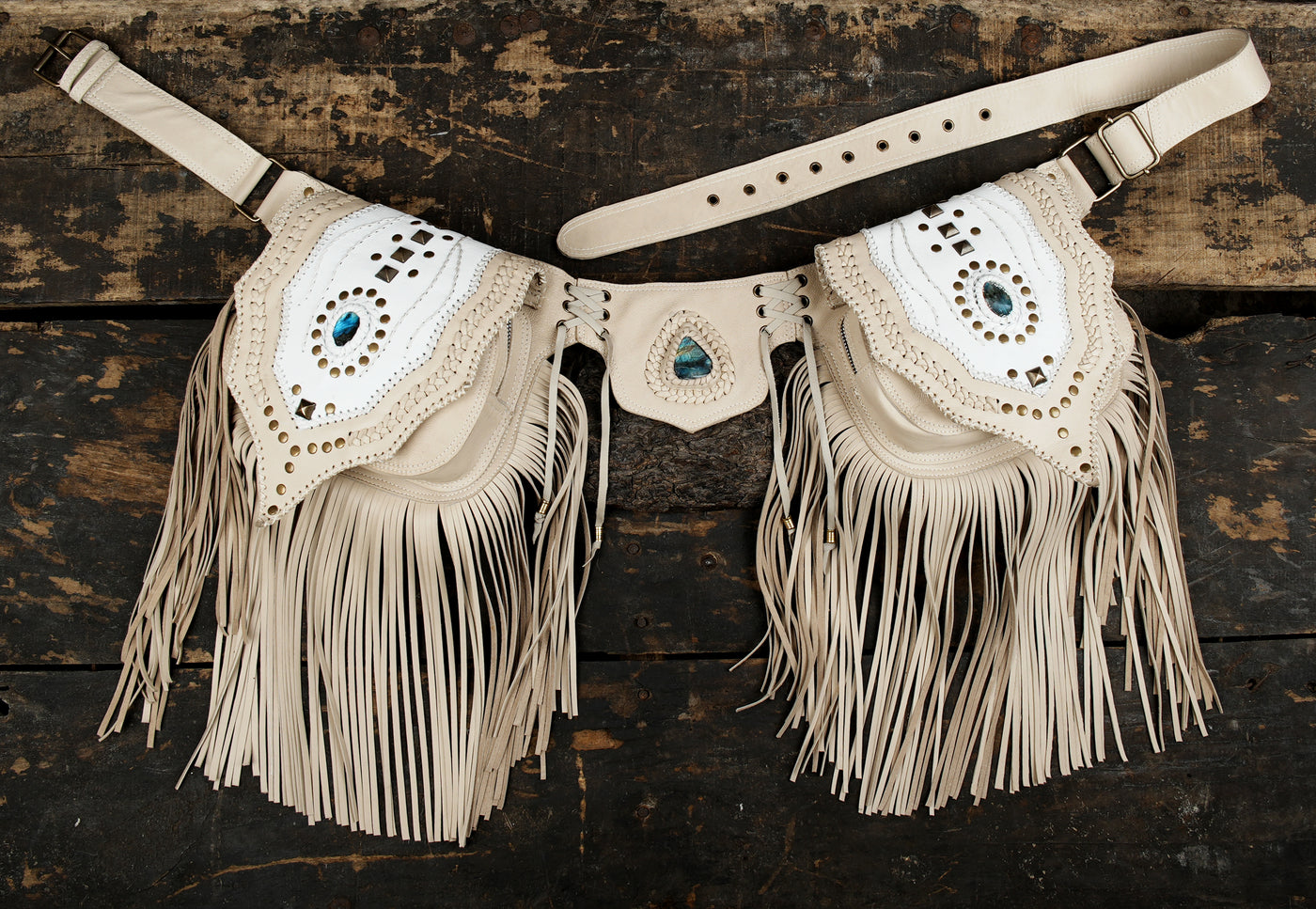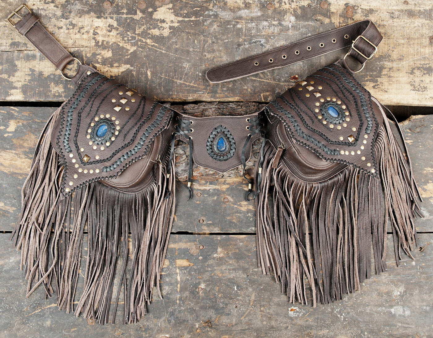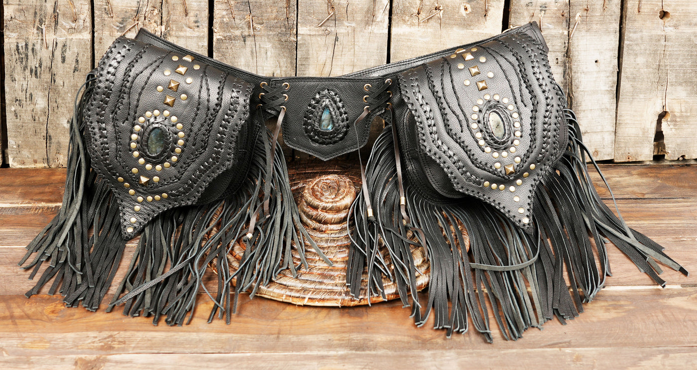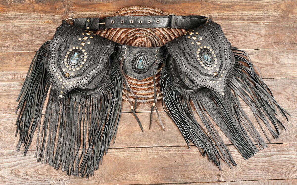 Handmade Fringe Leather Waist Belt Pouch || Unisex Leather Waist Pouch with Long Fringes (LT-AB-WB-6102) - Black / S – 28 TO 32 / Antic Brass