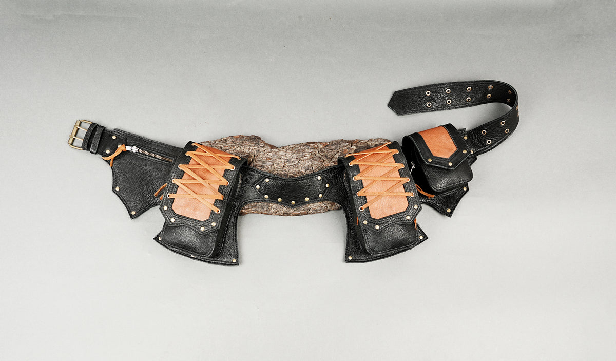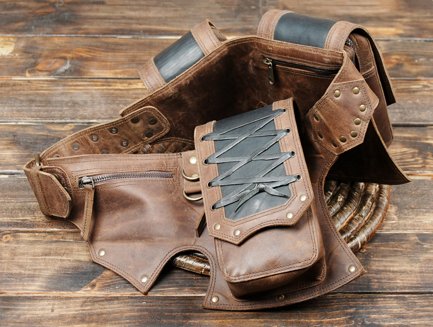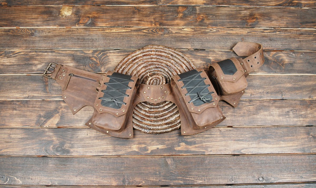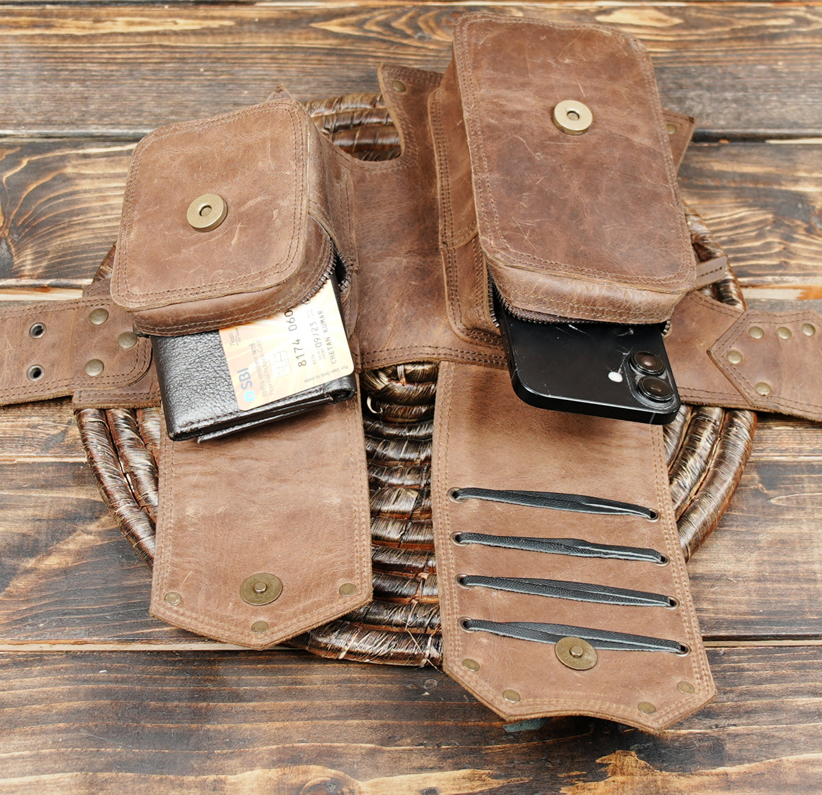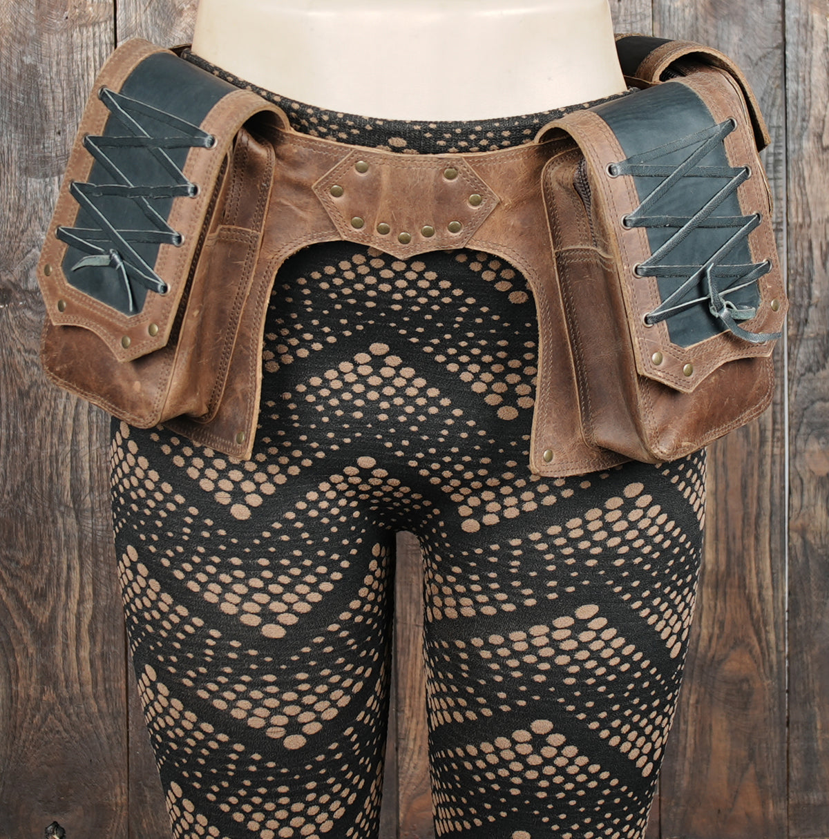 This waist belt is made from premium genuine leather in a rugged brown finish, giving it a strong and durable feel. The black crisscross lacing adds a bold handcrafted detail that makes the piece stand out. It includes dual pouches with enough room to keep essentials organized and secure. The reinforced rivets, sturdy stitching and heavy duty hardware help it hold up well over time. It’s a great fit for festivals, cosplay, steampunk outfits, biker style or everyday wear when you want something practical with character.